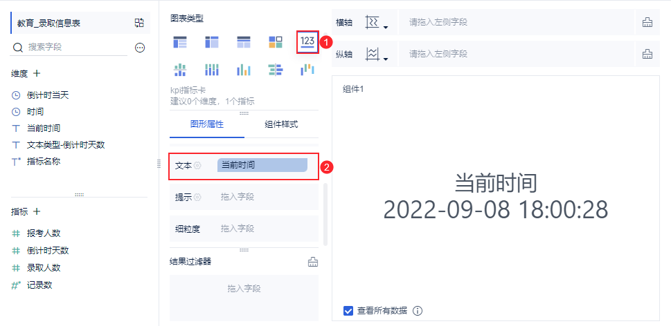 选择「指标卡」,并将「当前时间」字段拖入「图形属性>文本」栏,如下图所示: