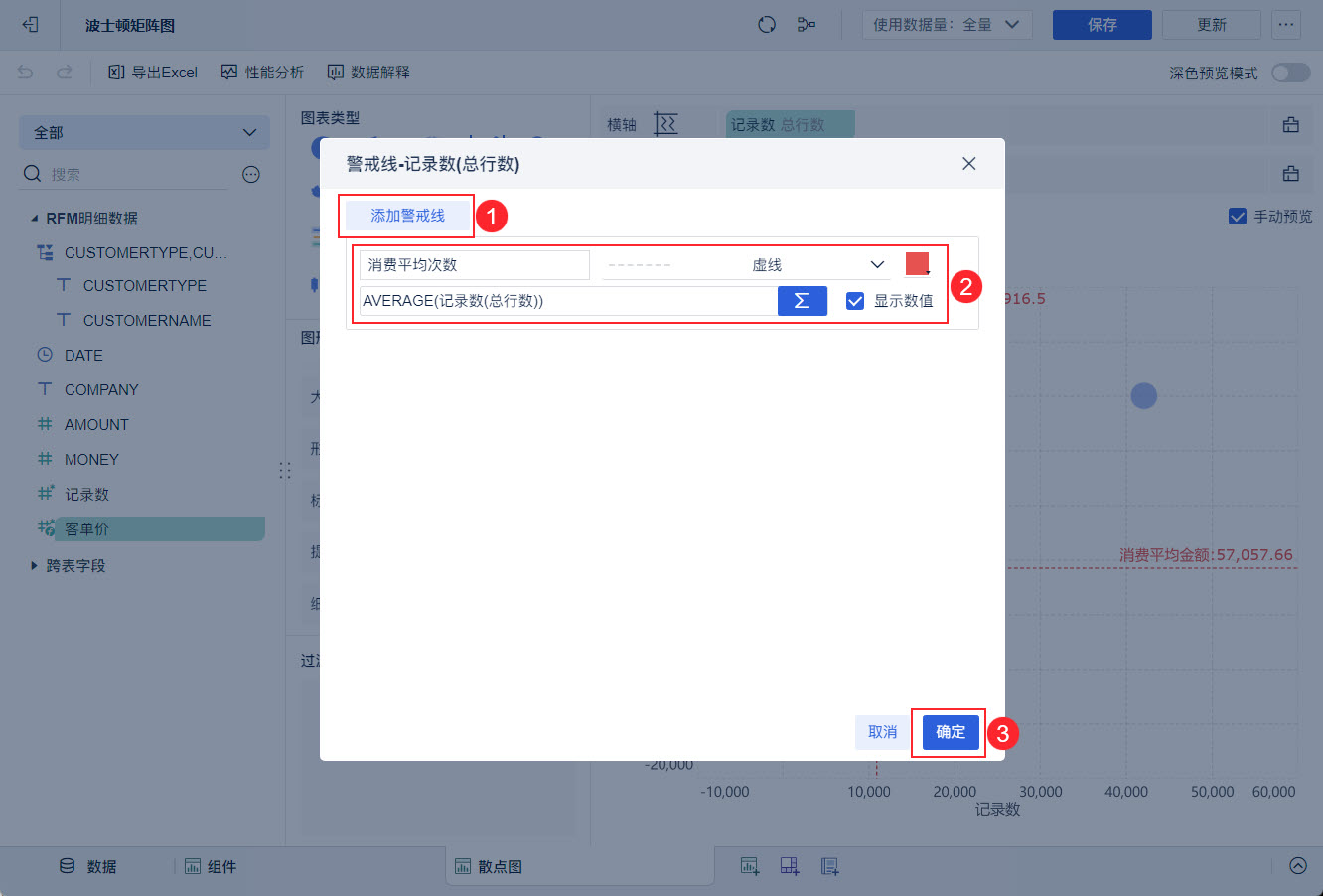 4)点击「添加警戒线」,命名为「消费平均金额」,设置公式AVERAGE(客单价),点击确定,可设置分析线颜色,如下图所示: