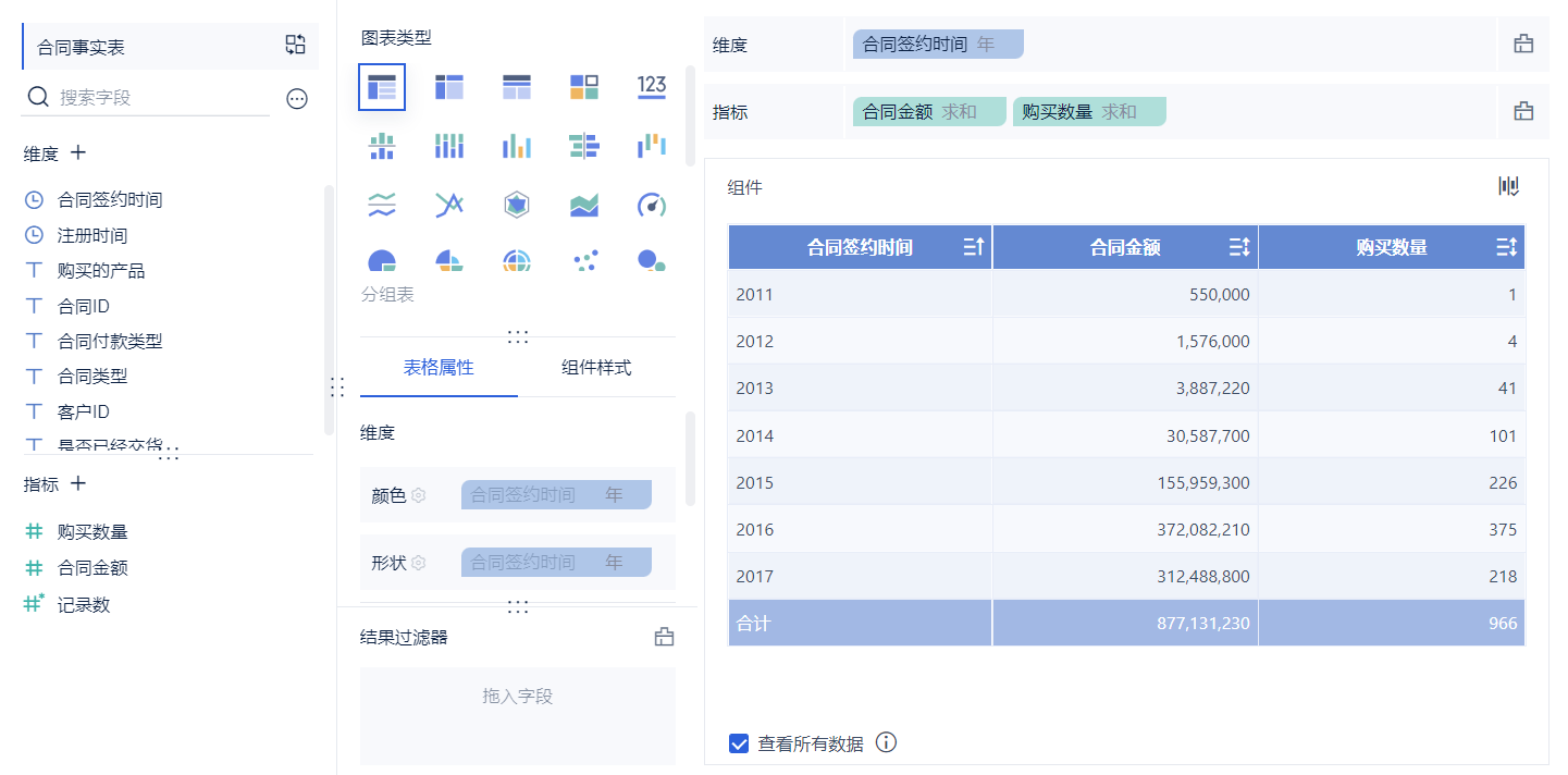 由于当前的分析维度为合同签约时间(年),则公式意义如下所示: