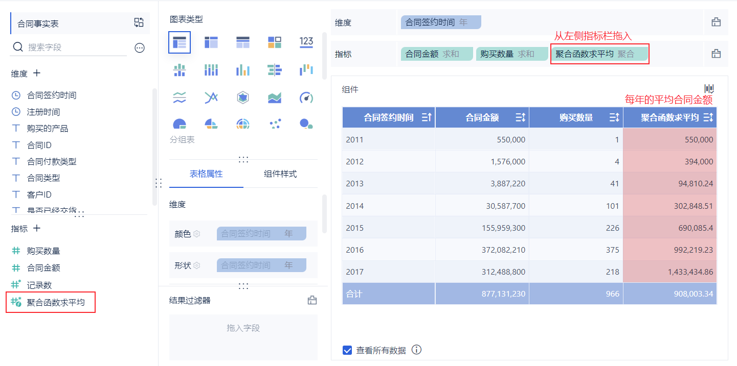 1)新增计算字段「聚合函数求平均」,输入公式:SUM_AGG(合同金额)/SUM_AGG(购买数量),操作方式如下图所示: