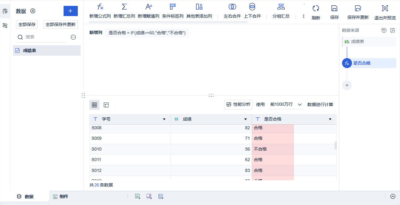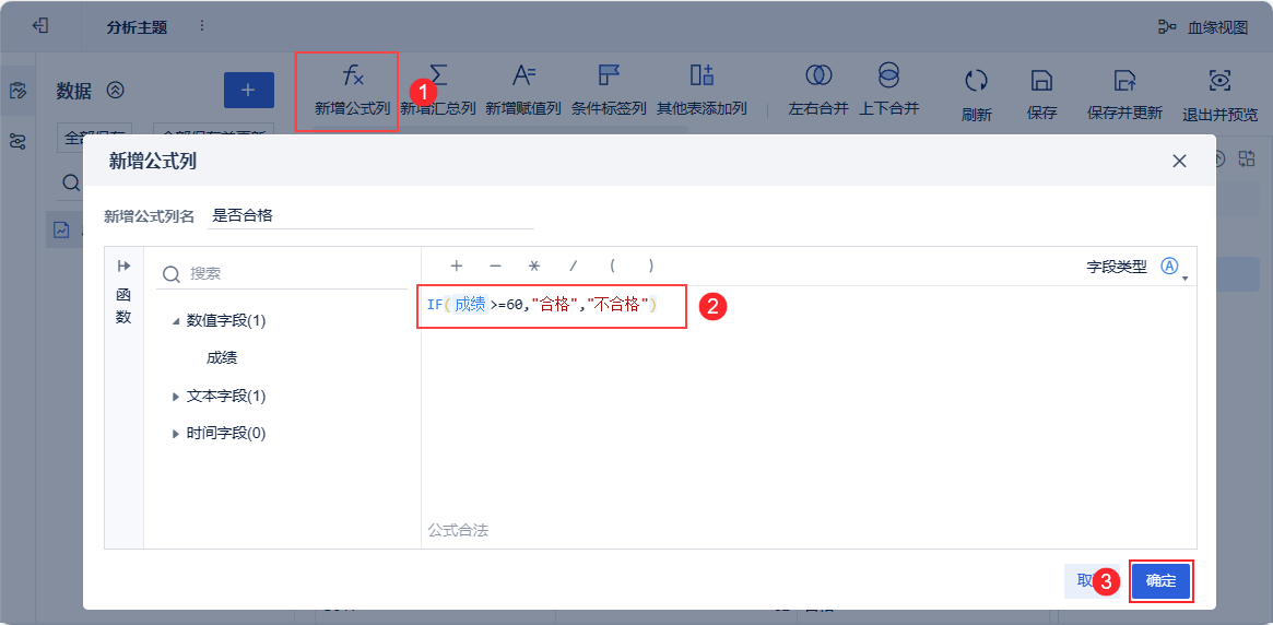 1)判断学生成绩是否合格。在主题中使用 新增列 ,输入如下图公式。