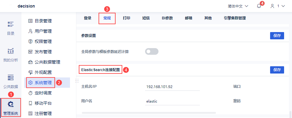 如在工程「管理系统>系统管理>常规」界面看到「ElasticSearch连接配置」,说明已启用ElasticSearch作为日志存储。