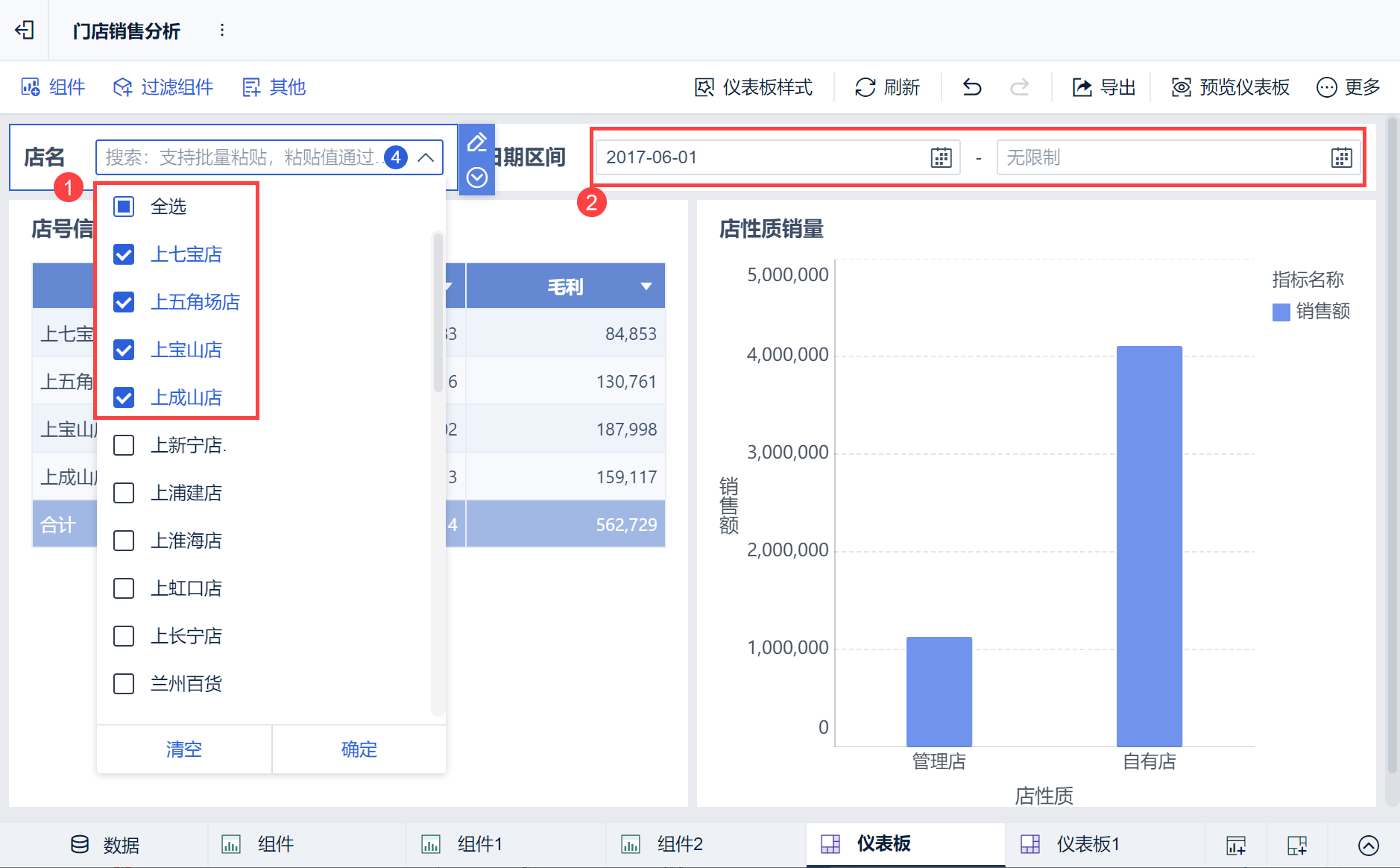 1)进入仪表板编辑界面,设置过滤组件过滤条件如下图所示: