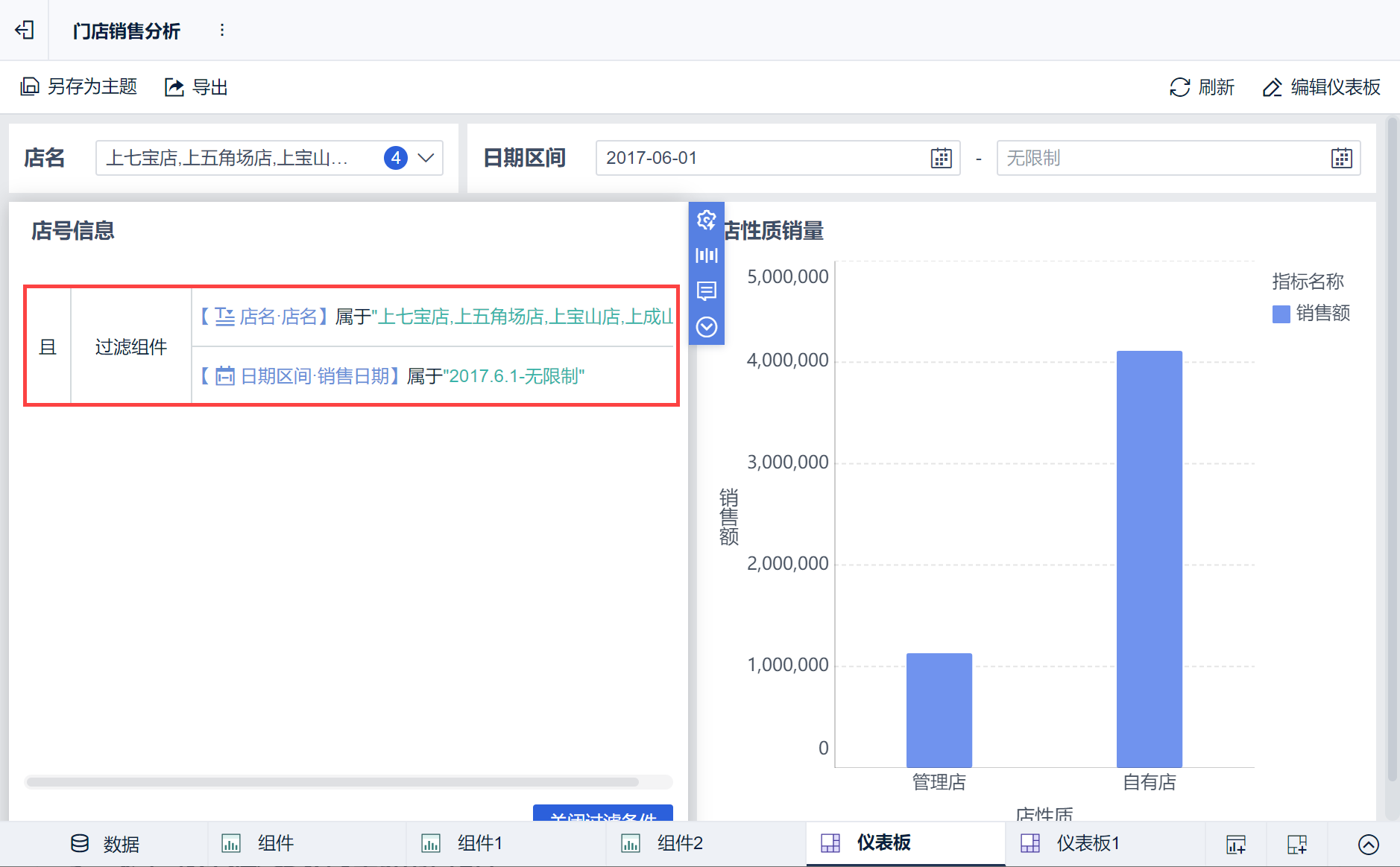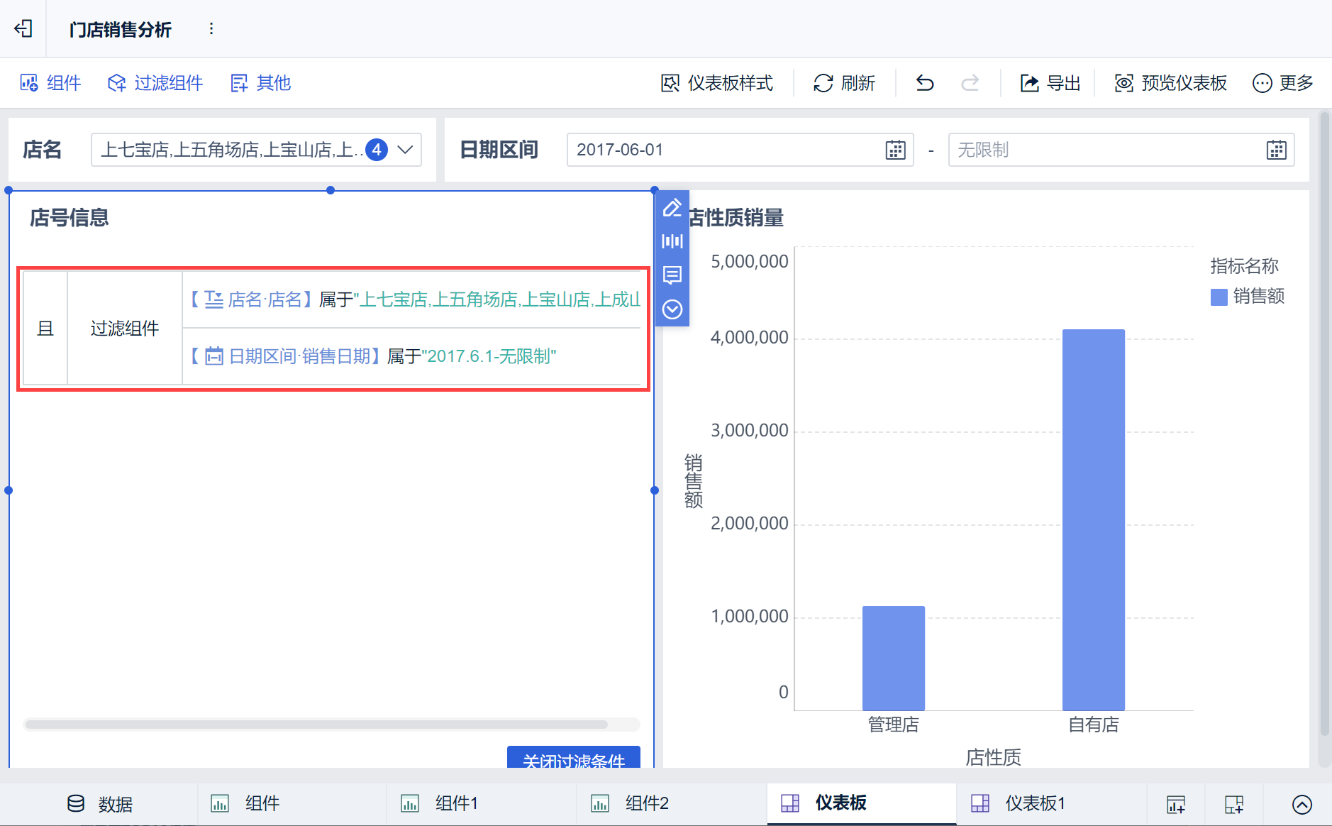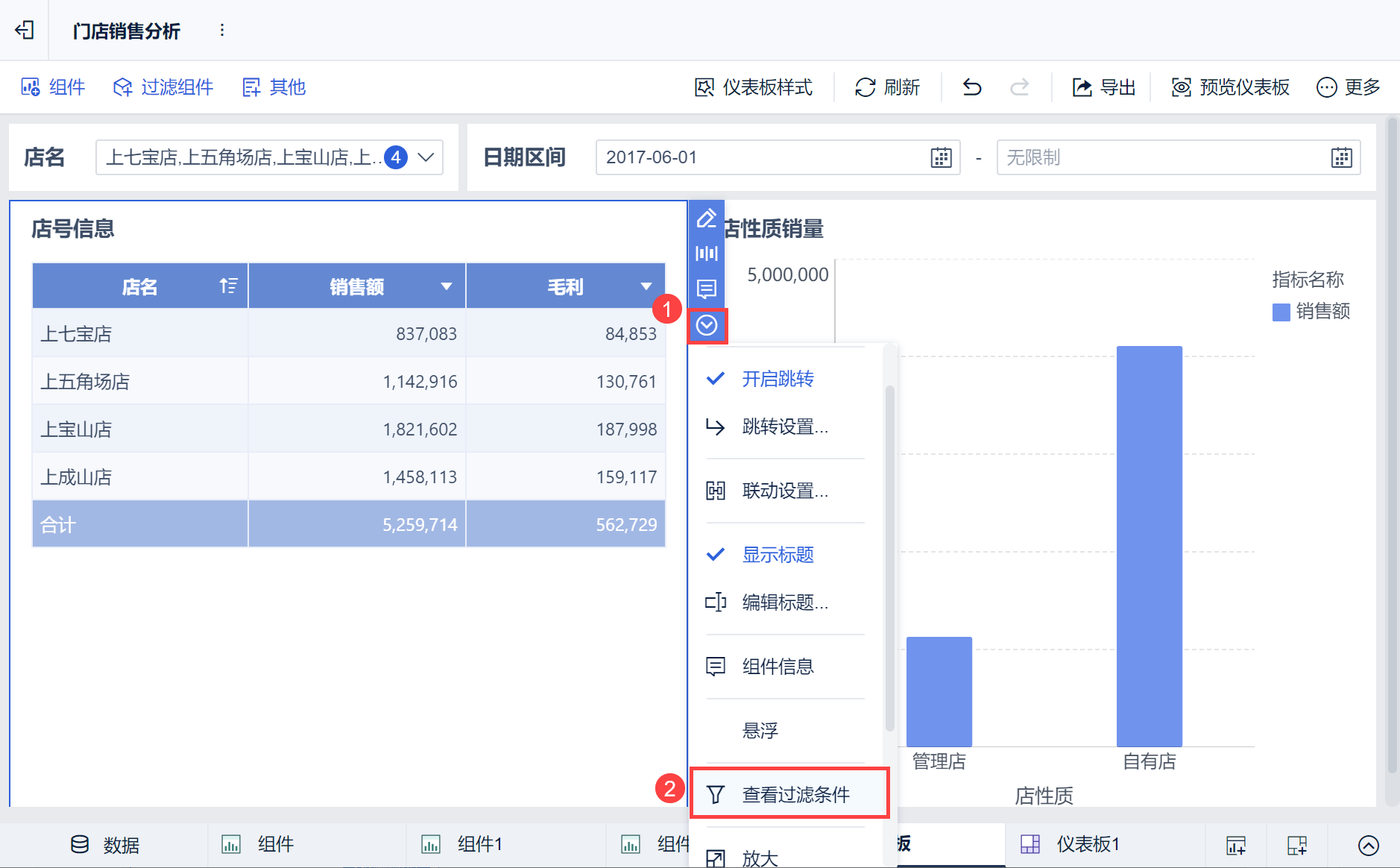 2)选中店号信息组件,点击「查看过滤条件」,如下图所示: