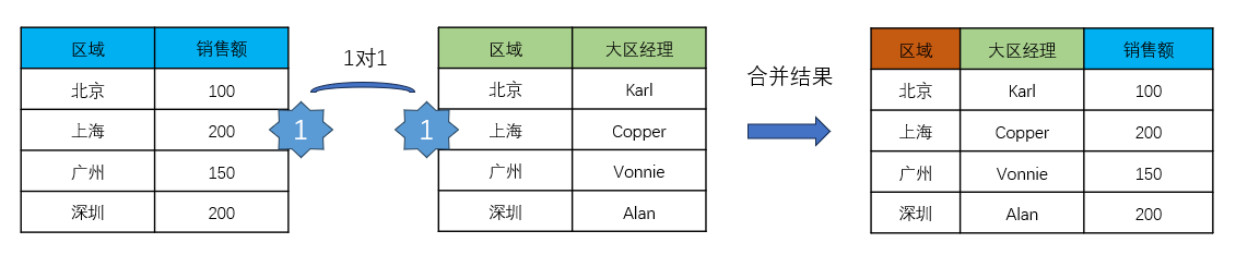 1) 1 对 1 的合并很简单,我们只需要将两张表按「区域」字段将左右两张表拼接起来。如下图所示: