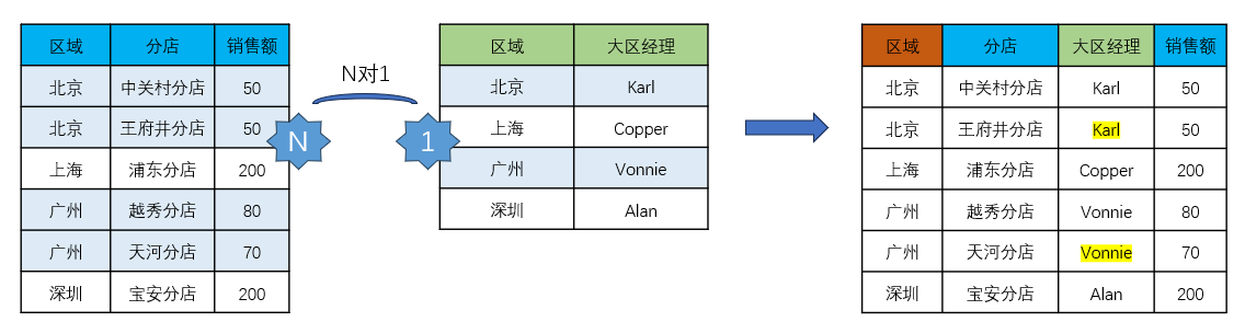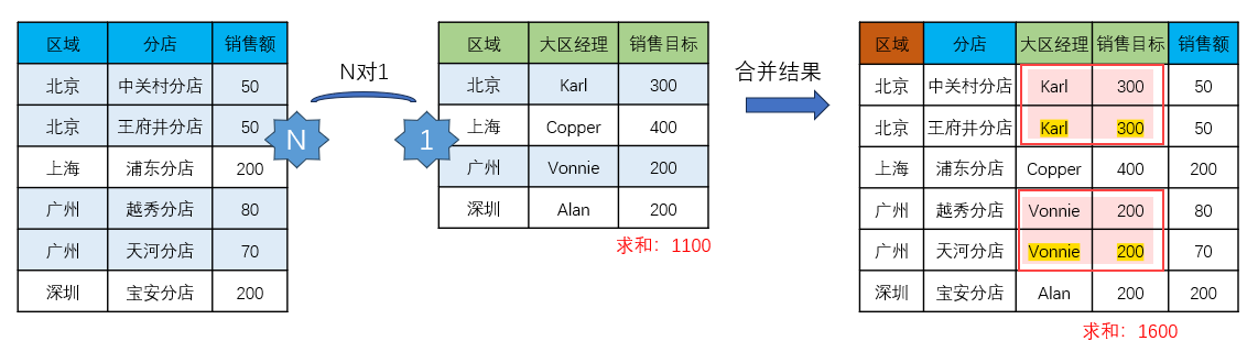 右表为了能和左表按「区域」进行拼接,则需要将北京和广州的数据也复制成两条数据。合并结果中我们可以看到大区经理字段膨胀了,标黄单元格就是被复制出来的数据。