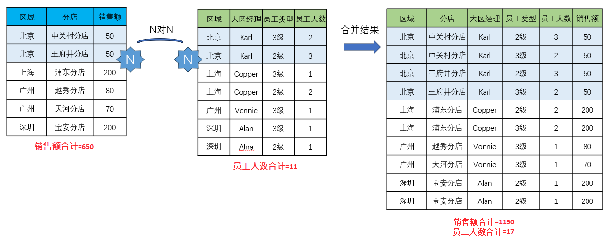 2) 那 N 对 1 是如何合并的呢?左侧表由于有了「分店」字段的加入,北京和广州分别有了两条数据。