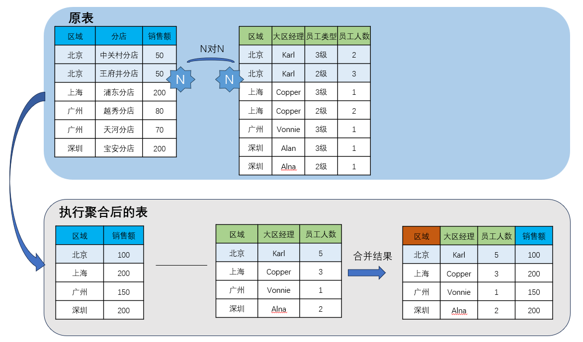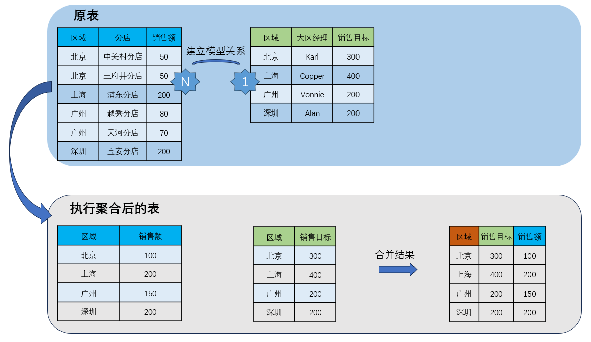 ③ 将聚合得到的两张表按关联字段「区域」进行合并,得到结果表;