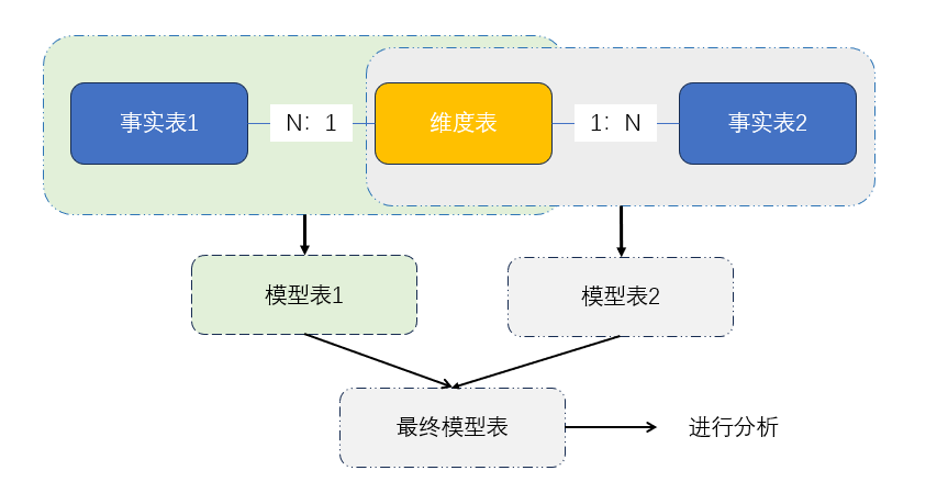 系统会按照主题模型的合并逻辑先让「事实表1、维度表」「事实表2、维度表」两两获得模型结果,使用得到的模型结果合并成最终我们想要使用的表,方便我们进行分析。