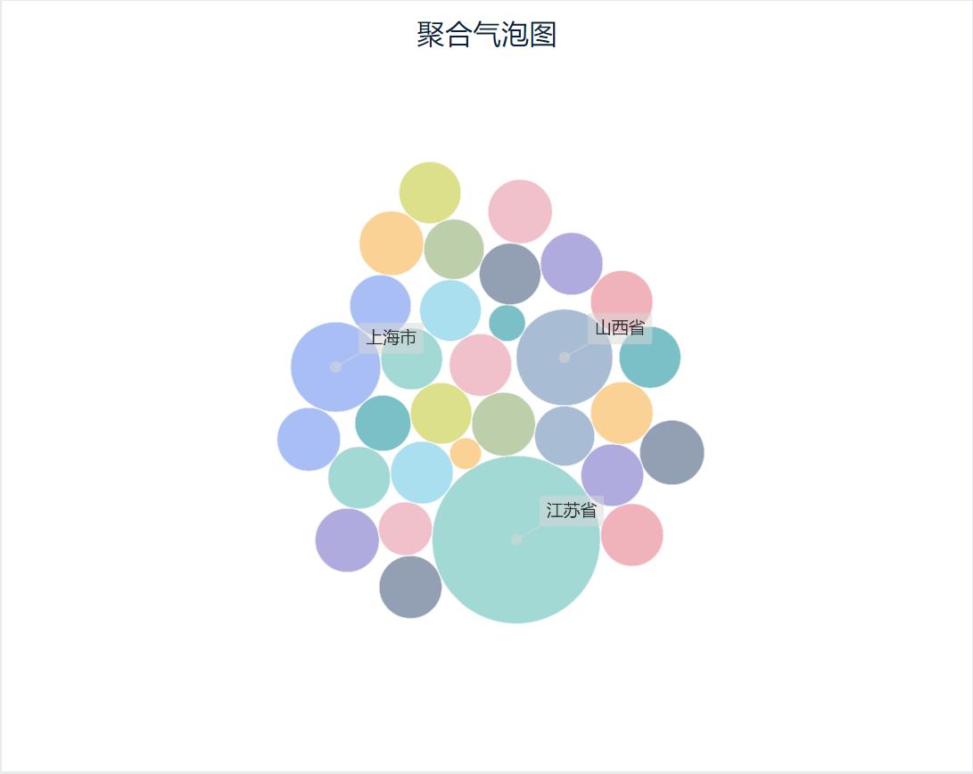 聚合气泡图通过气泡的大小来表示数据的大小或数量,并通过气泡的颜色来展示数据的类别或组别。适合展示多组数据,可以直观地比较不同类别之间的数值大小。