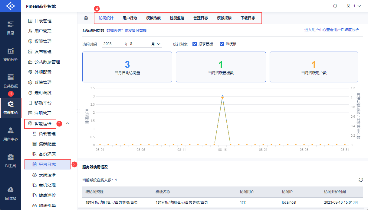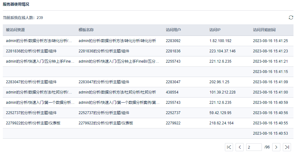 「服务器使用情况」列表中介绍「XX用户在XX时间XX地点访问了平台中的XX模板」。