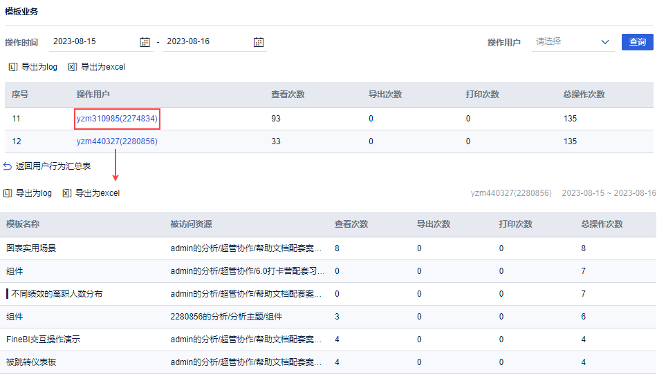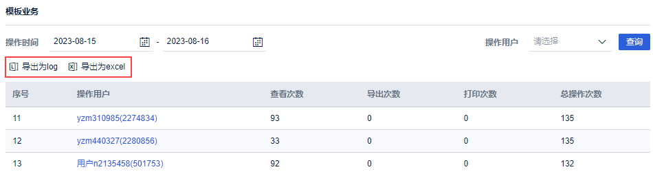 支持查看指定时间段内用户的访问频次以及操作行为,包括查看、导出等操作。