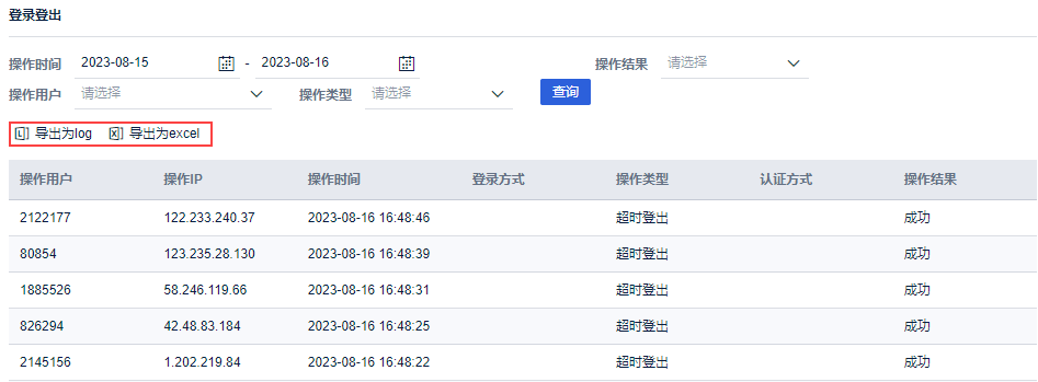 选择某个时间段,默认为「前一日」到「当日」,点击「查询」,即可查询该时间段下的登录登出记录。