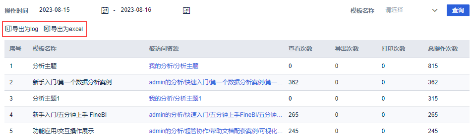 展现时以总操作次数降序展现,模板名称以平台中配置的名称显示,路径为模板的路径,如下图所示: