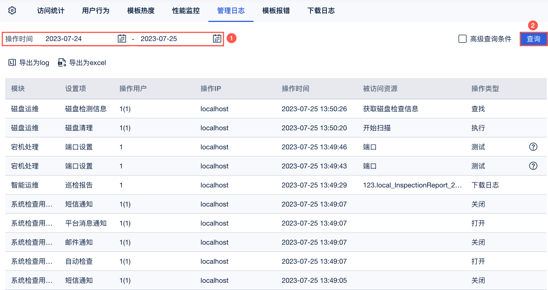 包括:访问统计、用户行为、模板热度、性能监控、管理日志、模板报错、下载日志。如下图所示:
