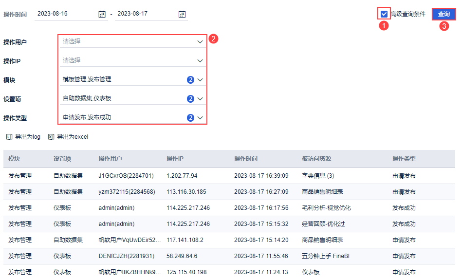 | 发布管理 | 自助数据集/仪表板 | 申请发布/发布成功/取消发布成功 |