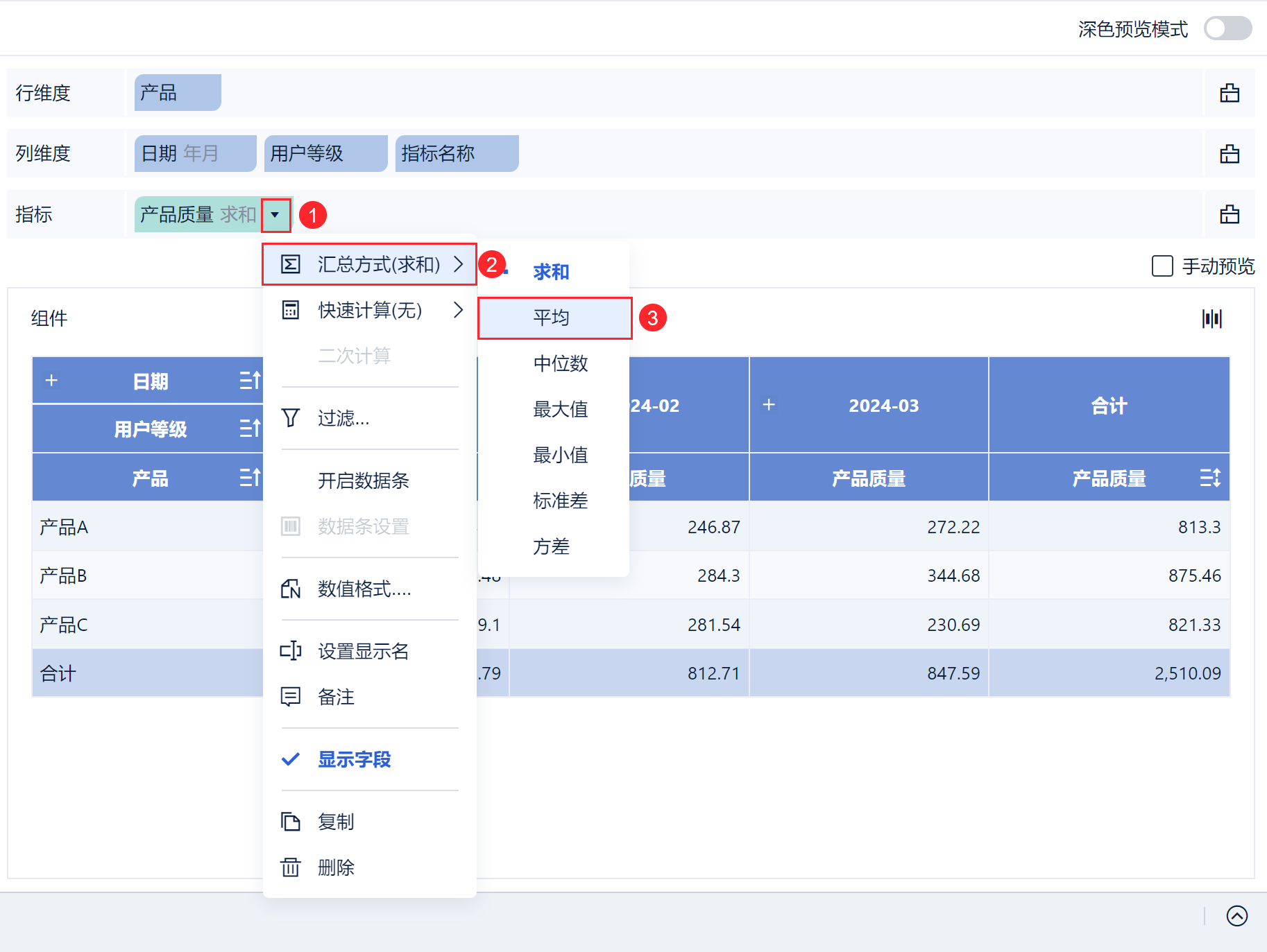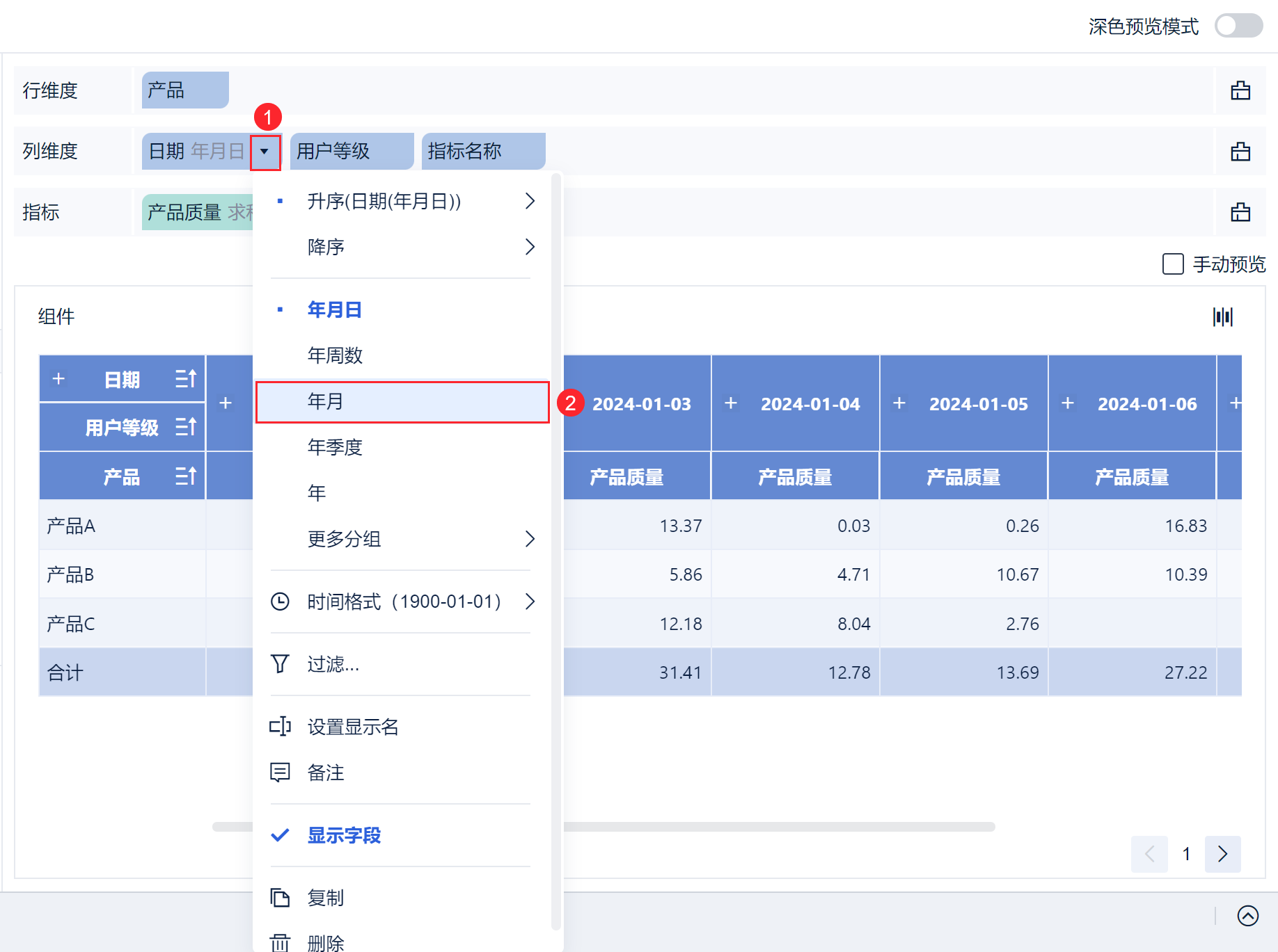点击「日期」字段下拉框,选择按「年月」分组显示,并修改「产品质量」的「汇总方式」为「平均」,如下图所示: