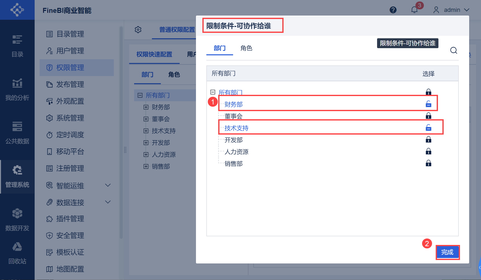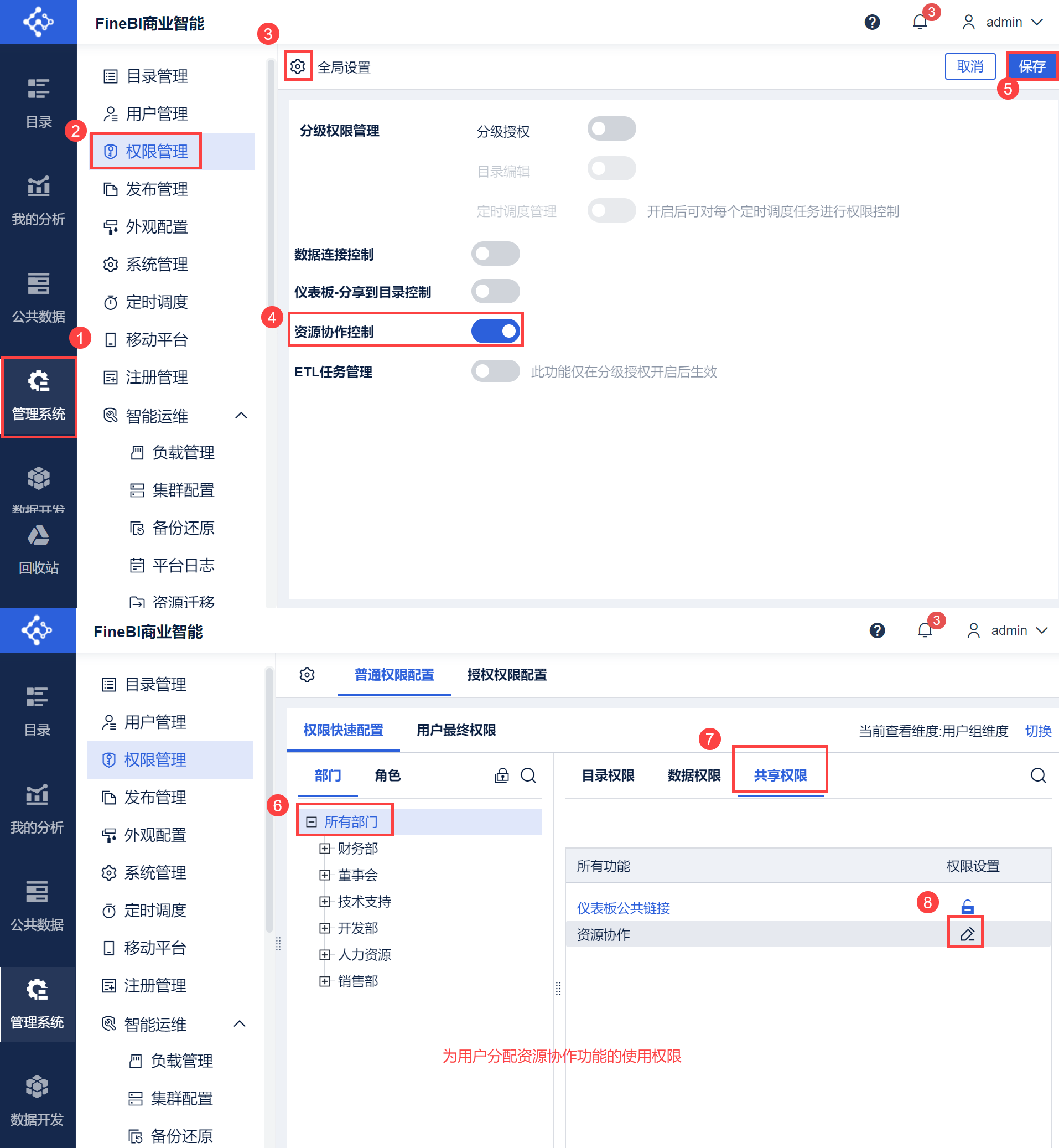 当用户已经创建了文件夹或者分析主题,管理员需要给用户分配了「资源协作」功能的使用权限(即可以将资源协作给谁),如下图所示: