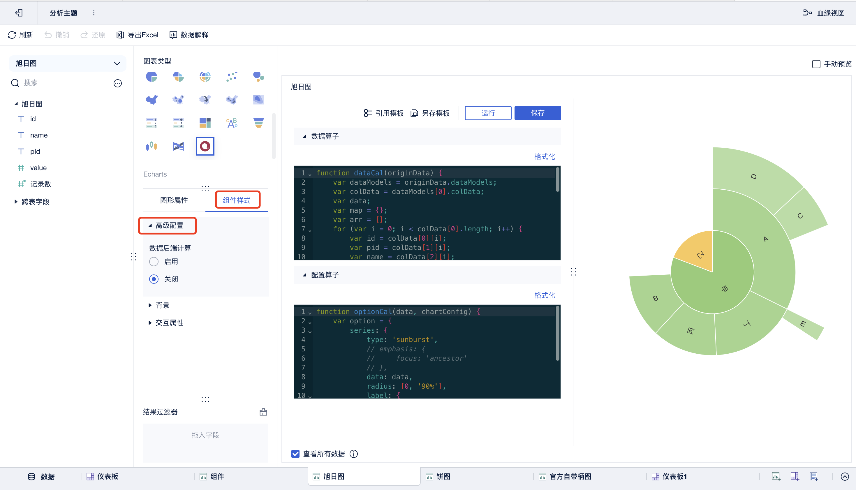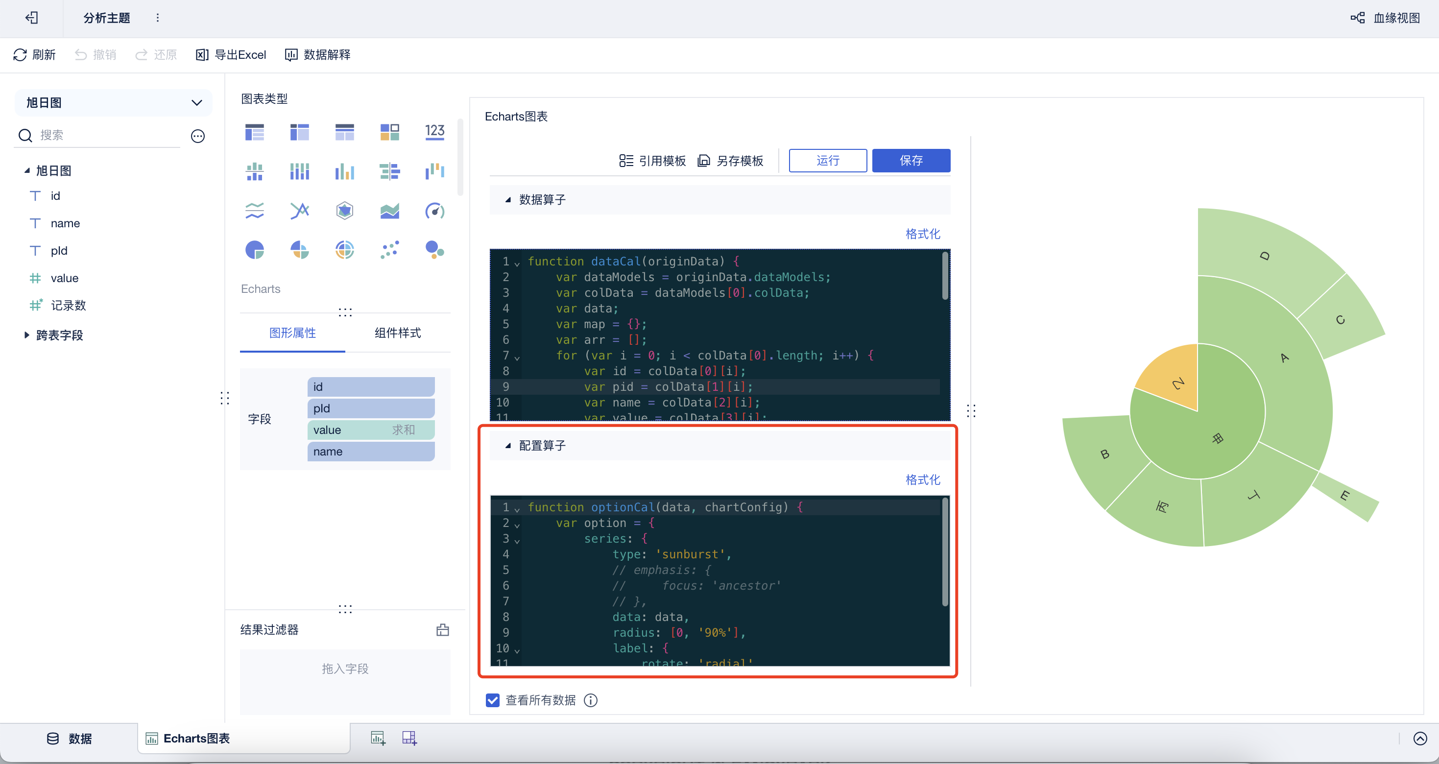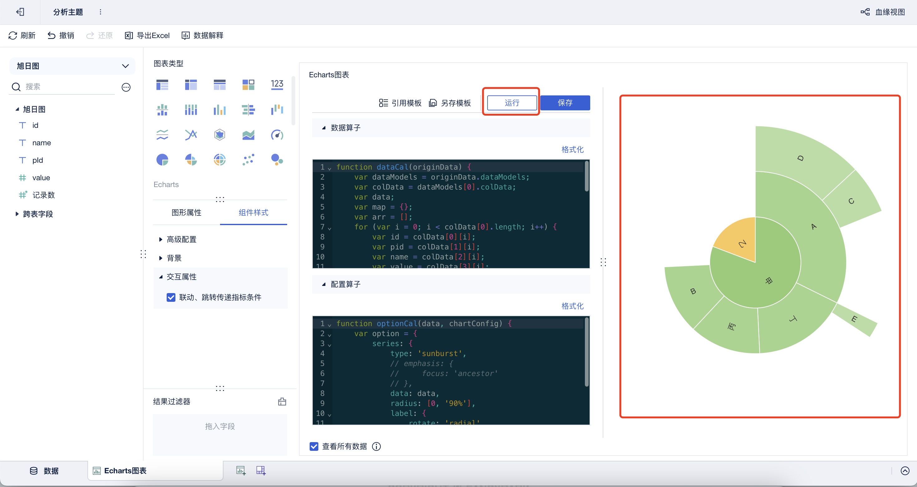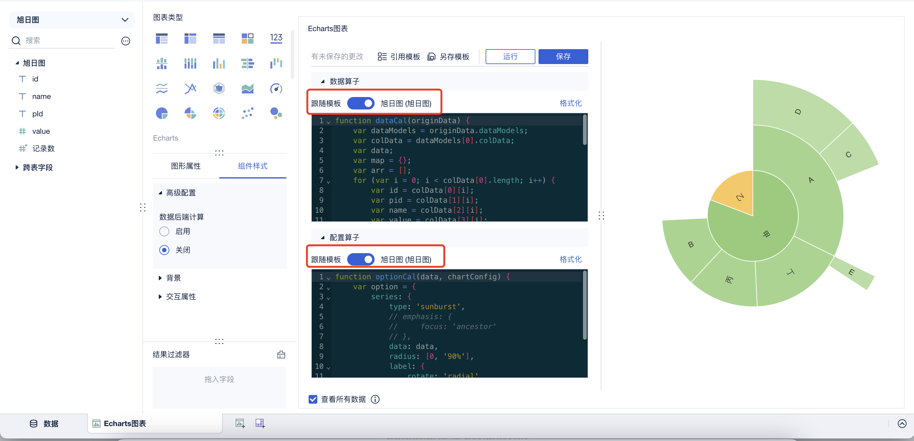 数据算子和配置算子编辑完成后,点击运行,可以在右侧预览图表样式,如果此时开启了后端计算,则配置算子需要保存后才可生效