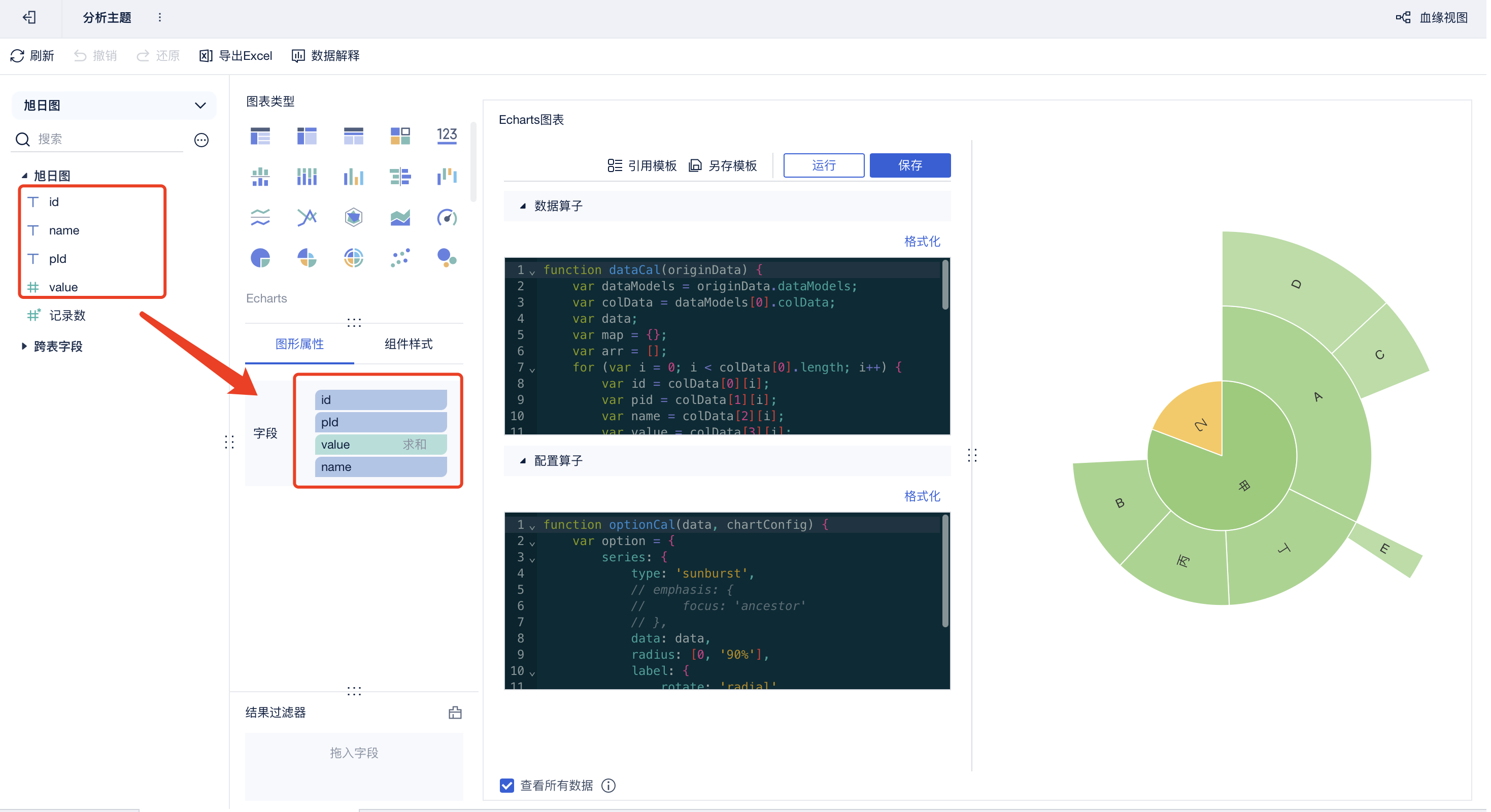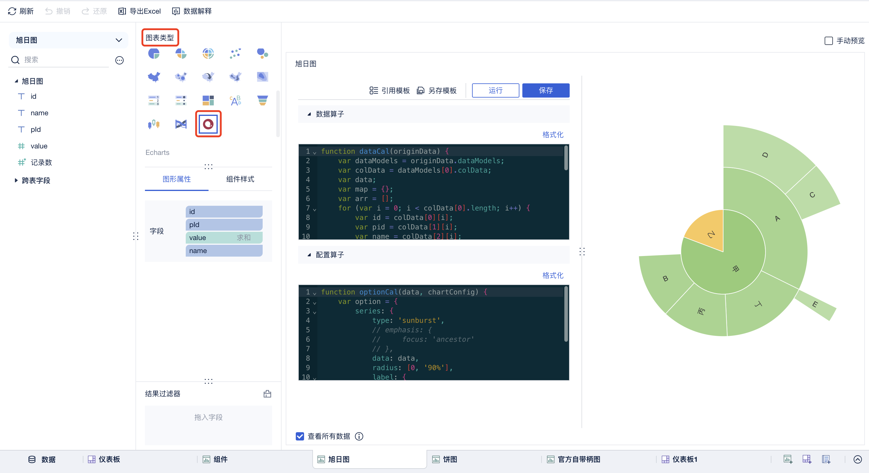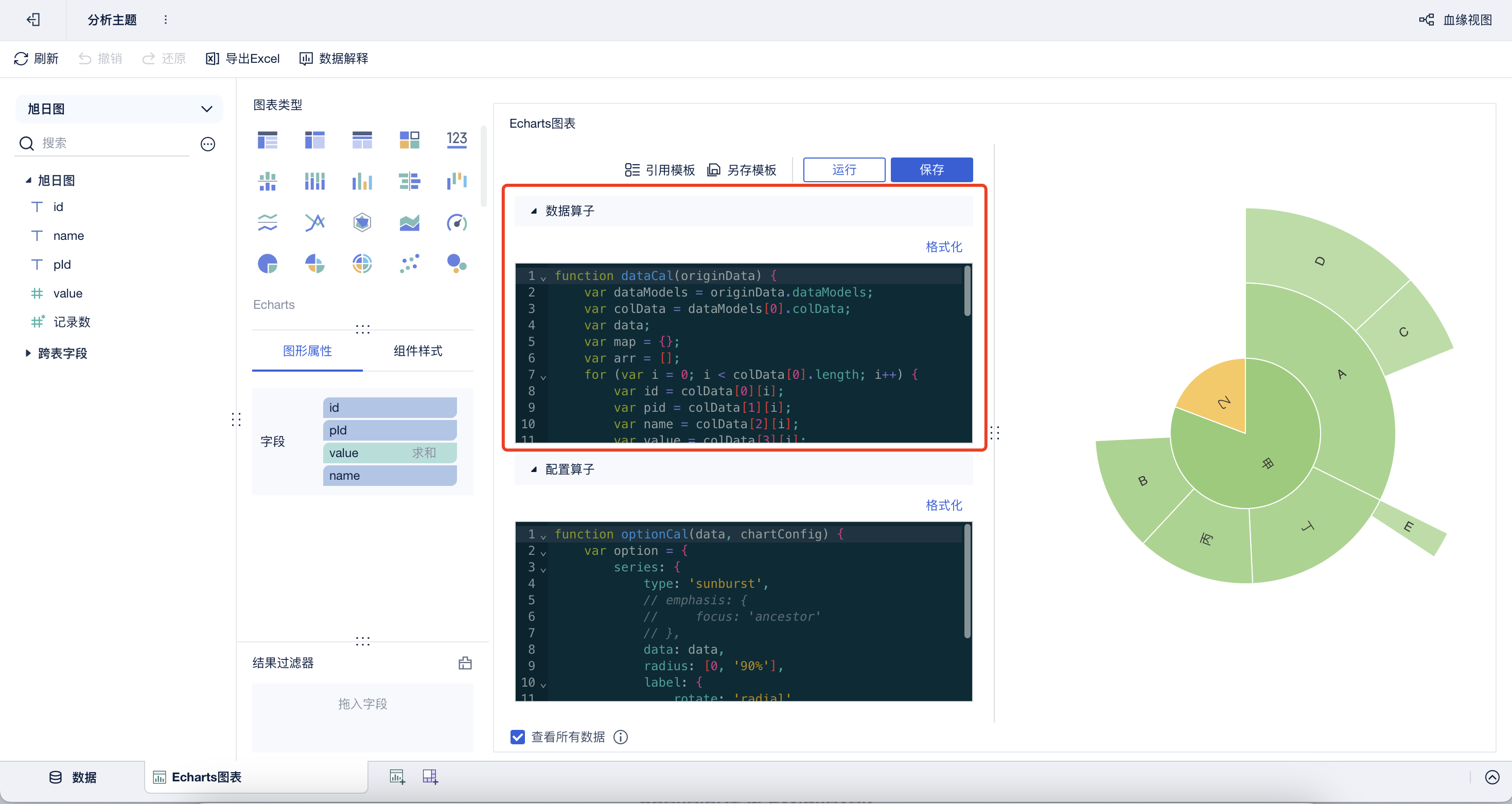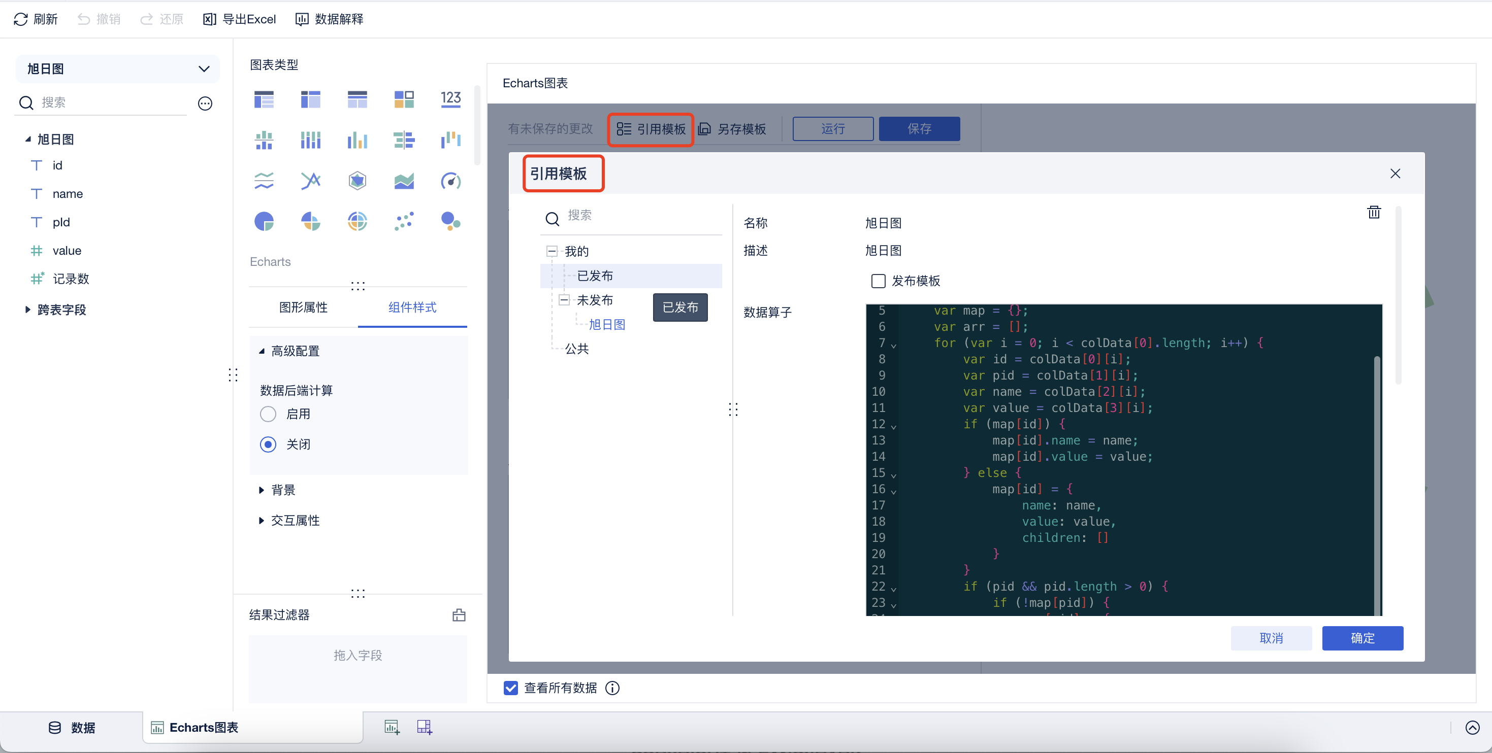 数据算子和配置算子编辑完成后,点击运行,可以在右侧预览图表样式,如果此时开启了后端计算,则配置算子需要保存后才可生效