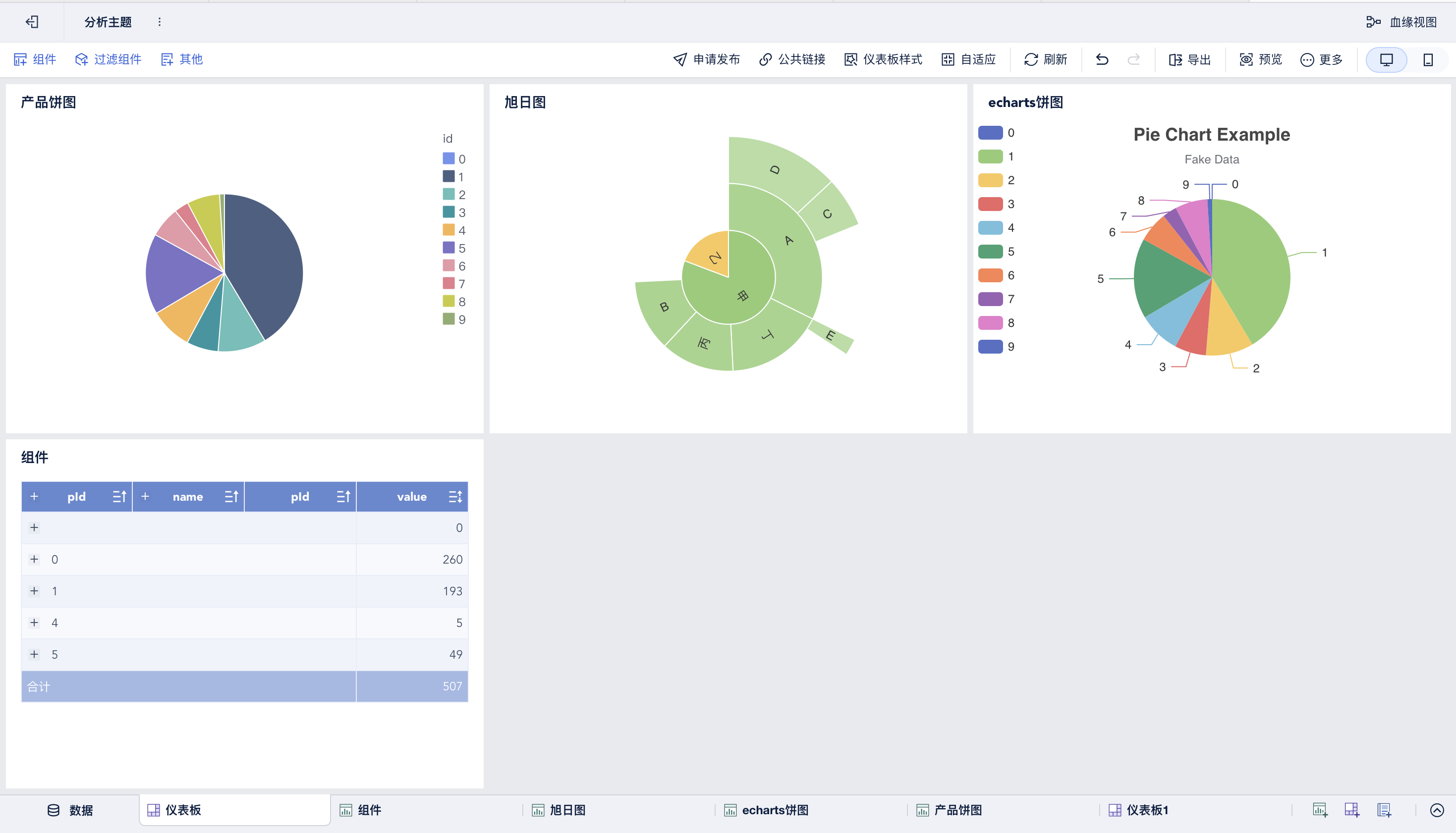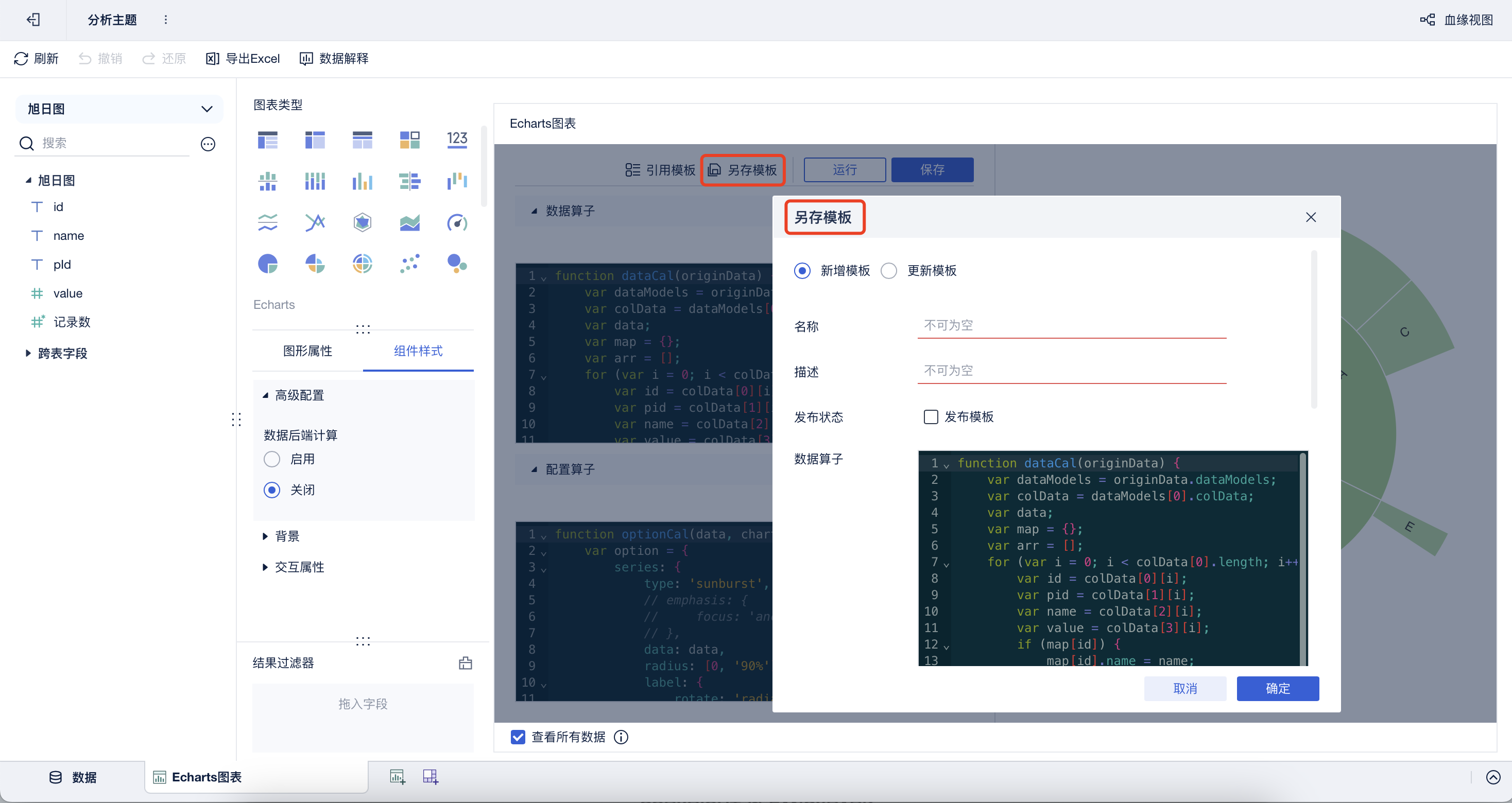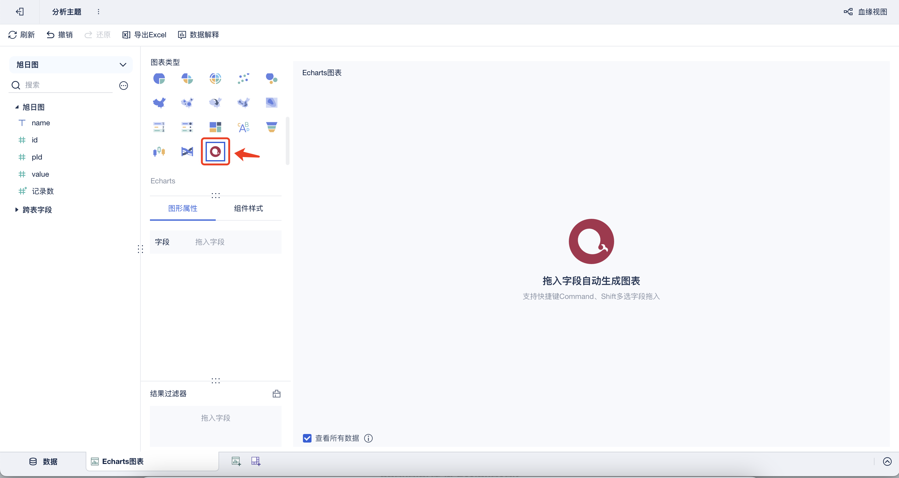 在分析主题界面,添加组件,进入组件编辑界面,图表类型选择Echarts图表