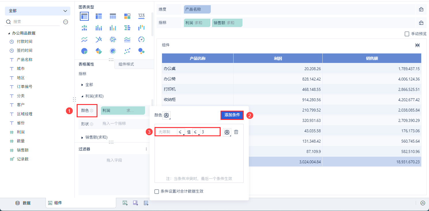 3)依据已经排名的利润字段进行颜色设置,点击「颜色>添加条件」,对 排名≤3 的数据进行属性设置,如下图所示: