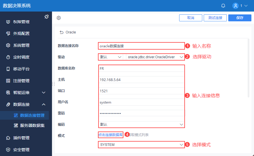 注:如果非管理员用户想要配置数据连接,需要管理员给其分配管理系统下数据连接节点的权限,具体操作请查看 数据连接权限