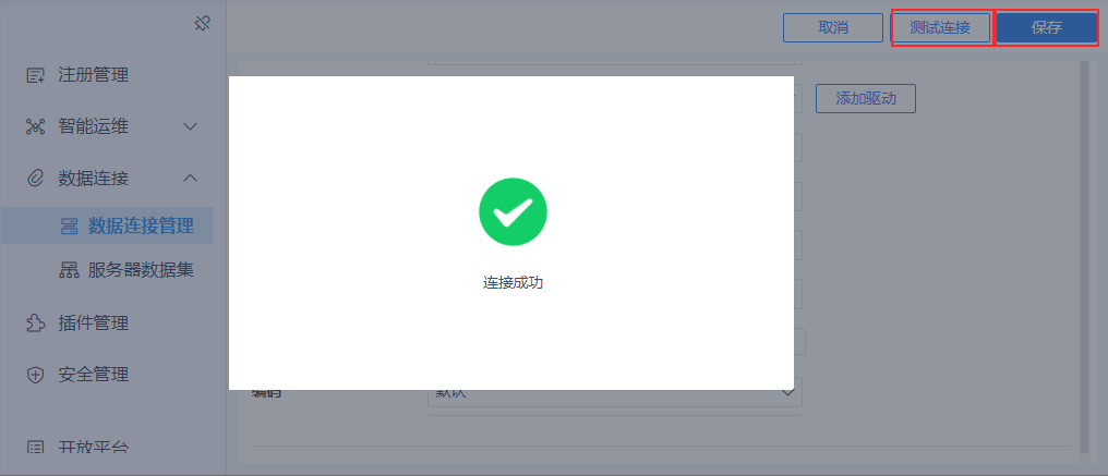 4)点击「测试连接」,若连接成功则点击「保存」。如下图所示:
