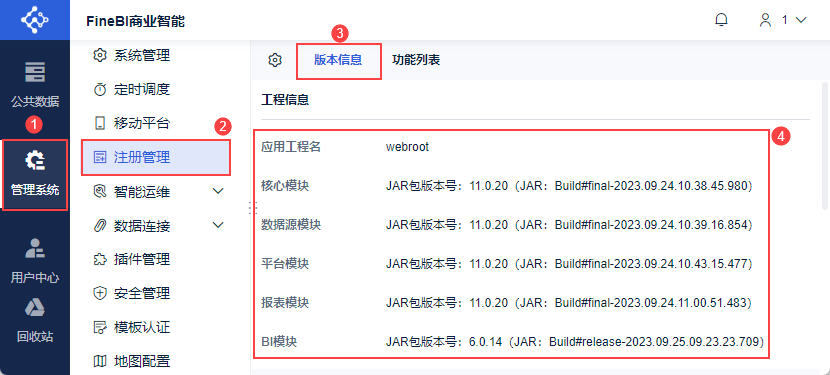 | 附件 | 工程版本信息 | 管理员登录FineBI系统,点击「管理系统>注册管理>版本信息」,查看版本信息。 请将此页面完整截图,作为附件发送