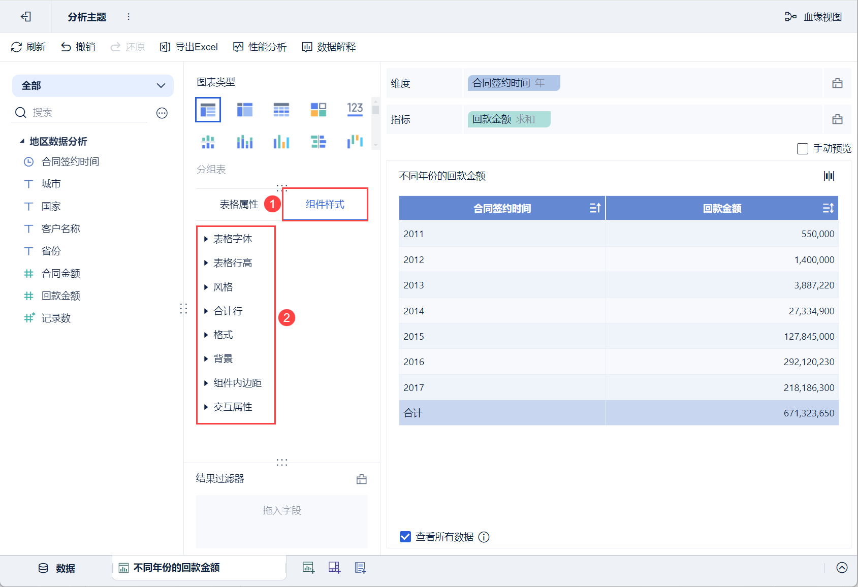 分组表、交叉表、明细表支持调整的组件样式功能有所区别,如下表所示: