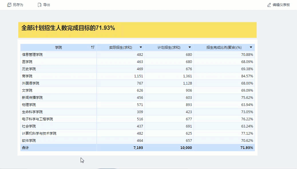 SUM_AGG(实际招生)/SUM_AGG(计划招生):本例代表按照「学院」维度先对「实际招生」和「计划招生」进行分组求和,计算得出「实际招生」占「计划招生」的比例。