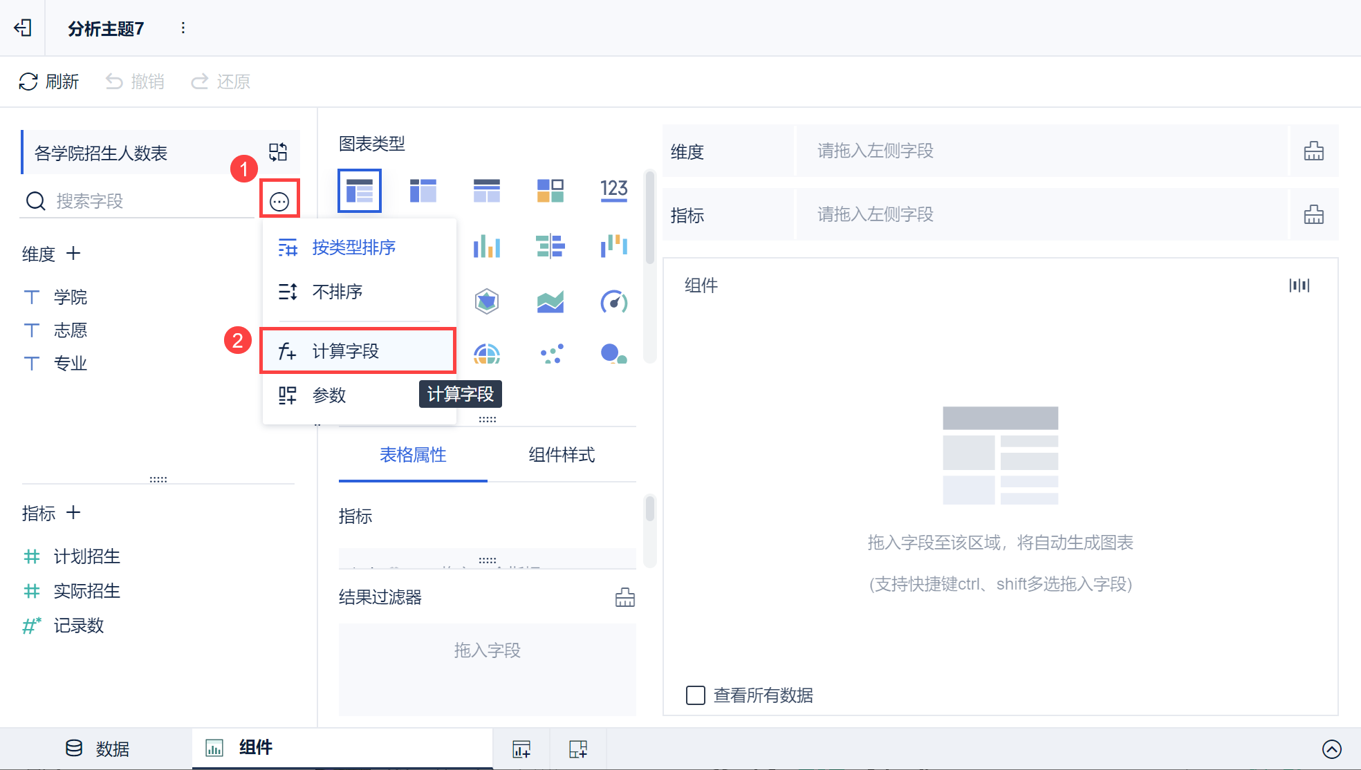 1)进入组件编辑界面,添加计算指标。如下图所示: