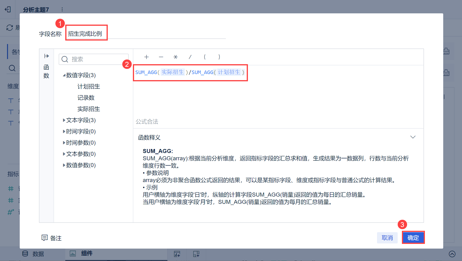 注:聚合函数 SUM_AGG() 公式内容需选择左侧字段才能生效。本例添加「计划招生」和「实际招生」字段。