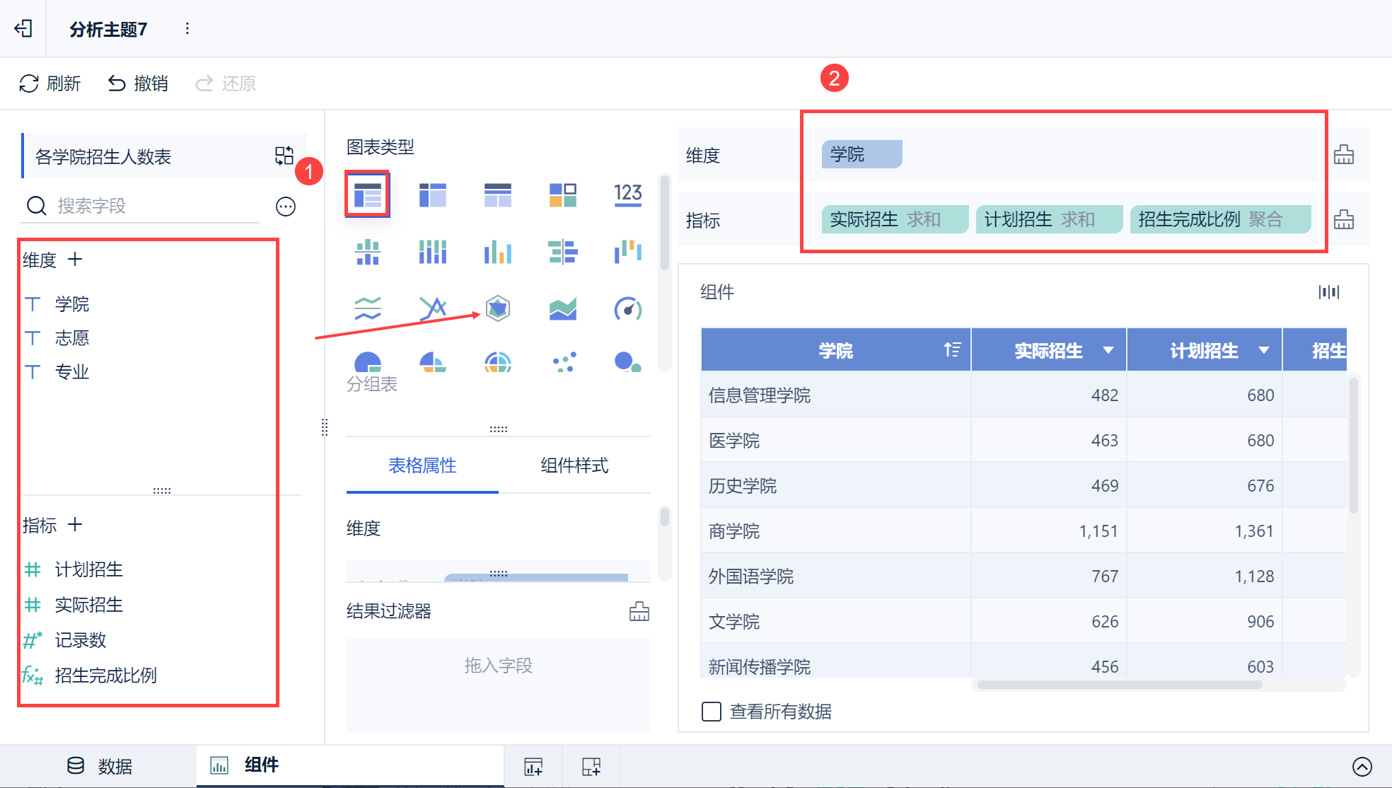 新建分析主题,选择「各学院招生人数表」,如下图所示: