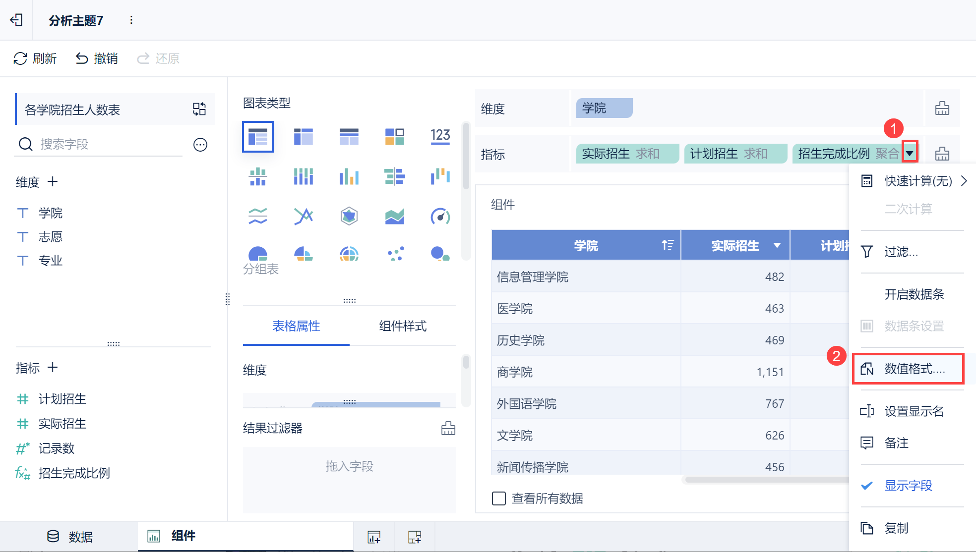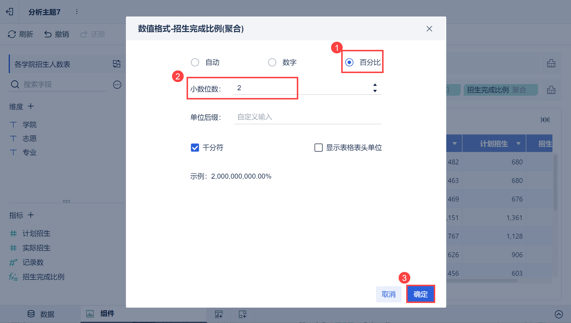 1)点击「招生完成比例(聚合)> v >数值格式」,设置该字段数值展示形式。如下图所示: