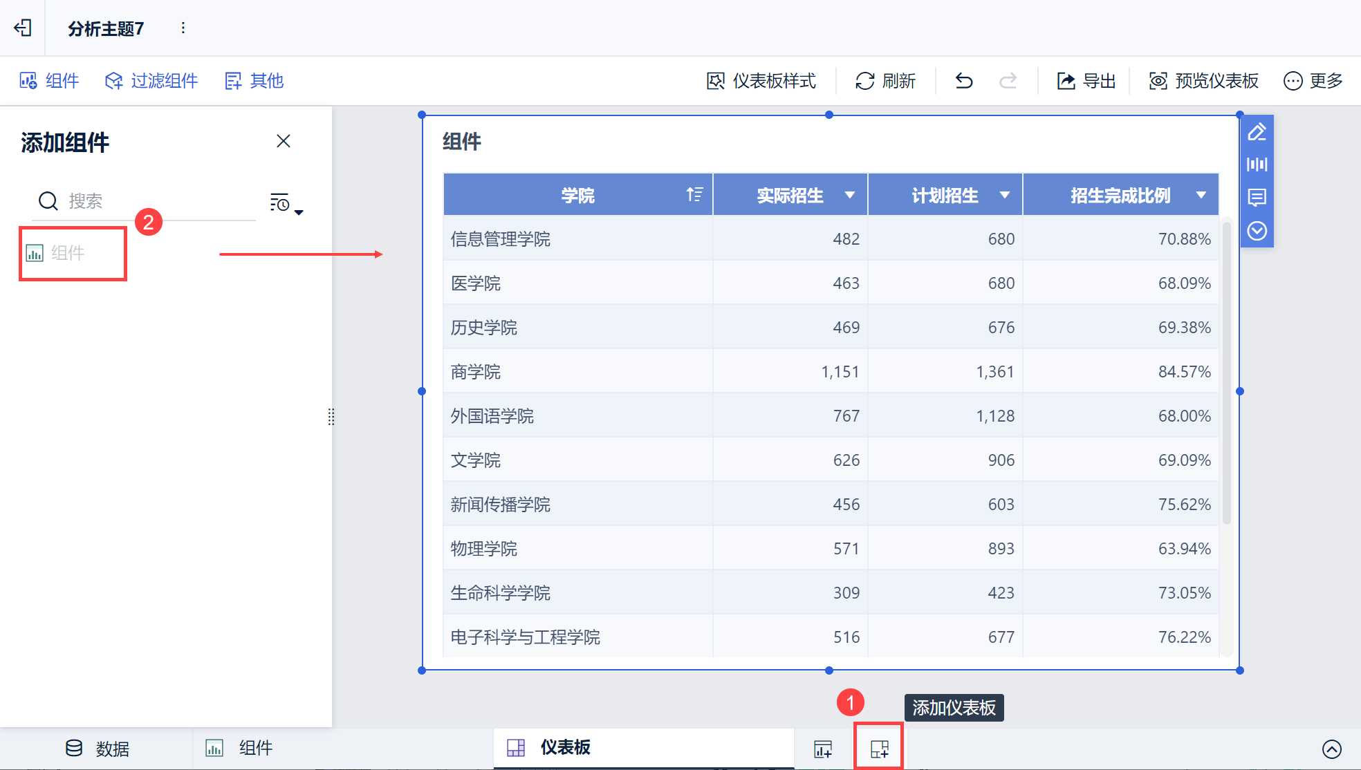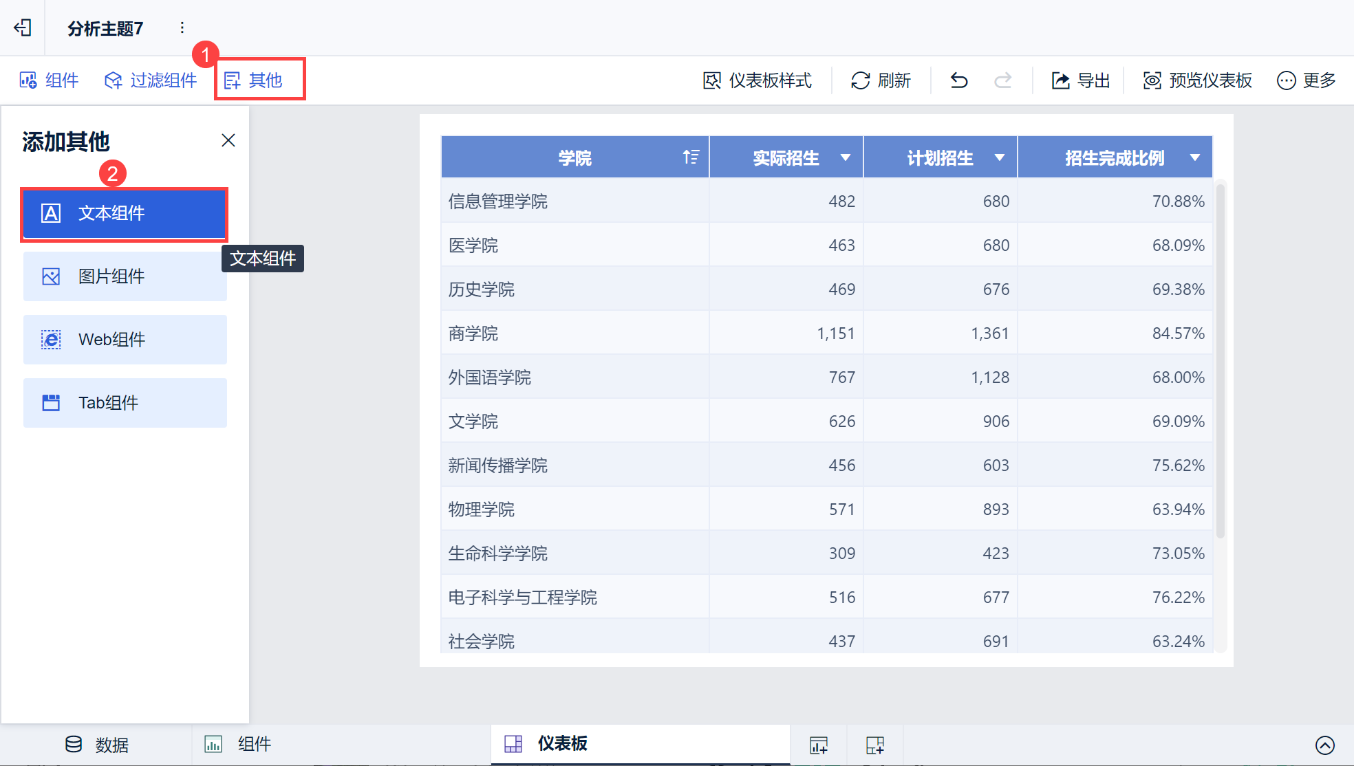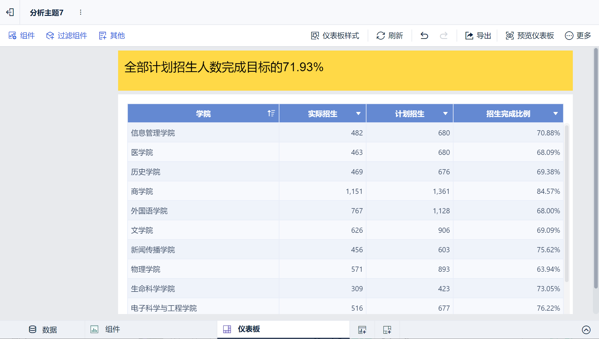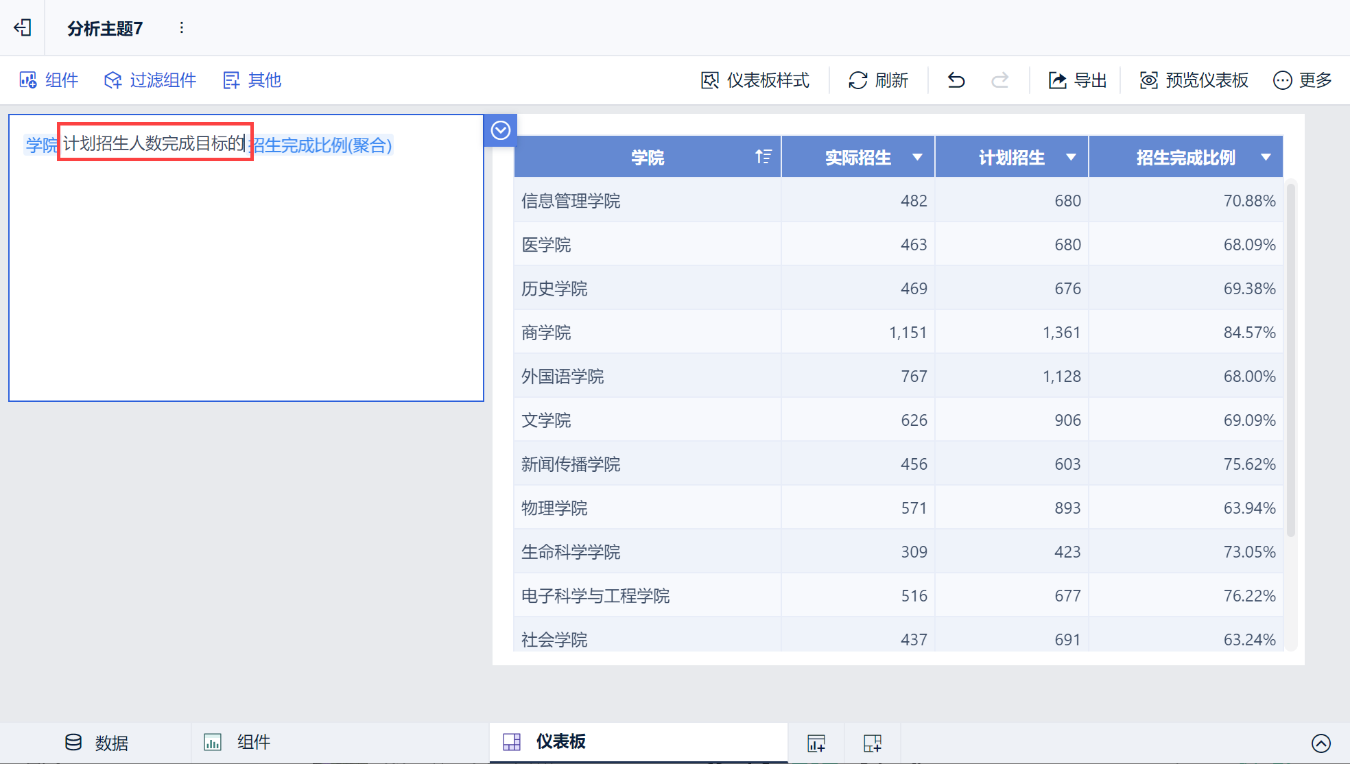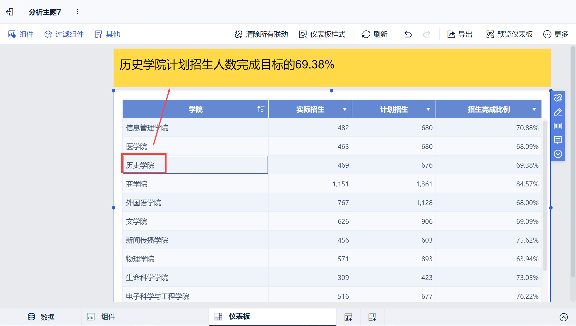 2)然后再点击仪表板预览,预览状态下的默认值即变成「历史学院计划招生认数完成目标的69.38%」。