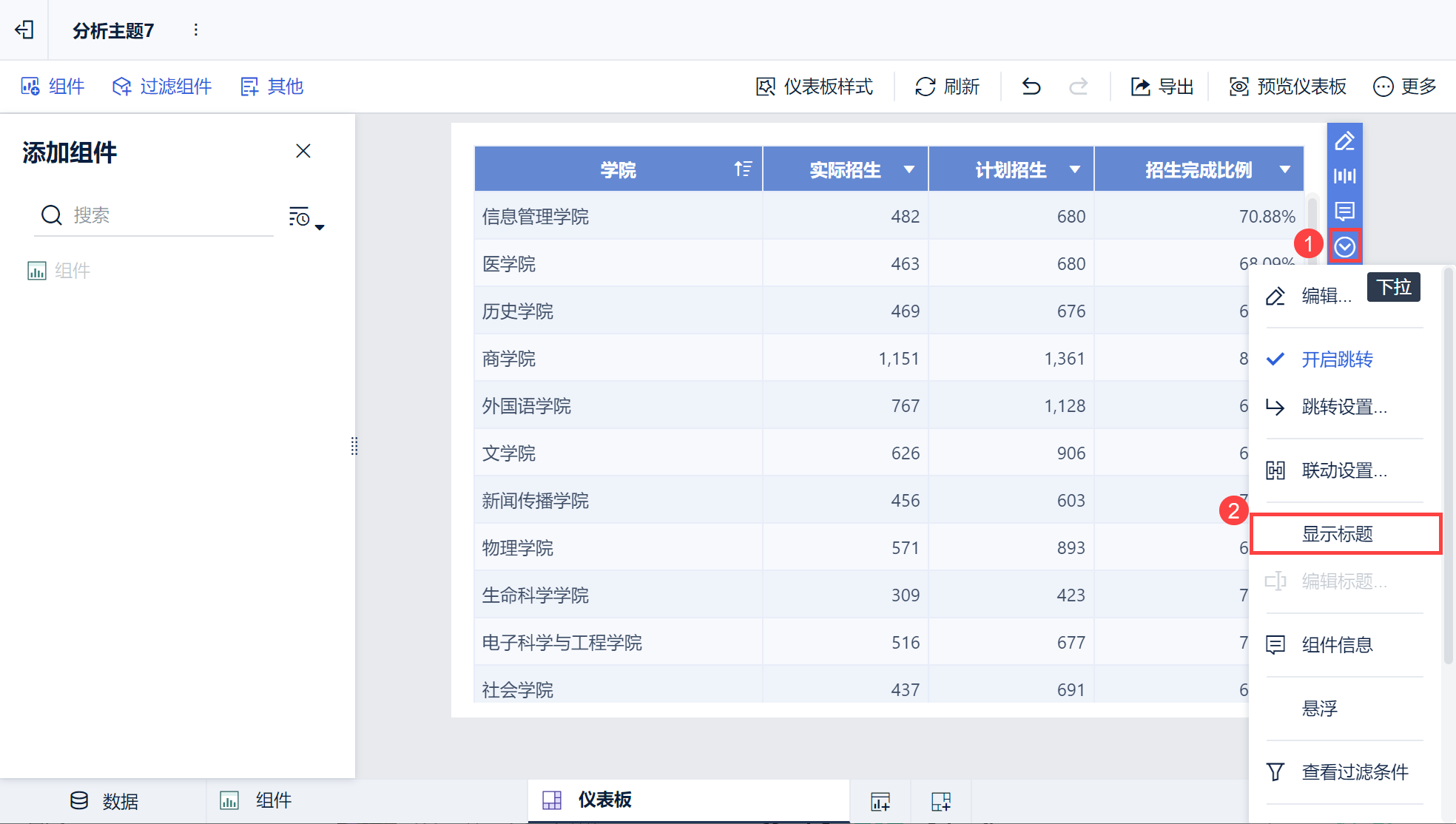 2)选中组件,点击「 v 」后,取消勾选「显示标题」即可隐藏标题。如下图所示: