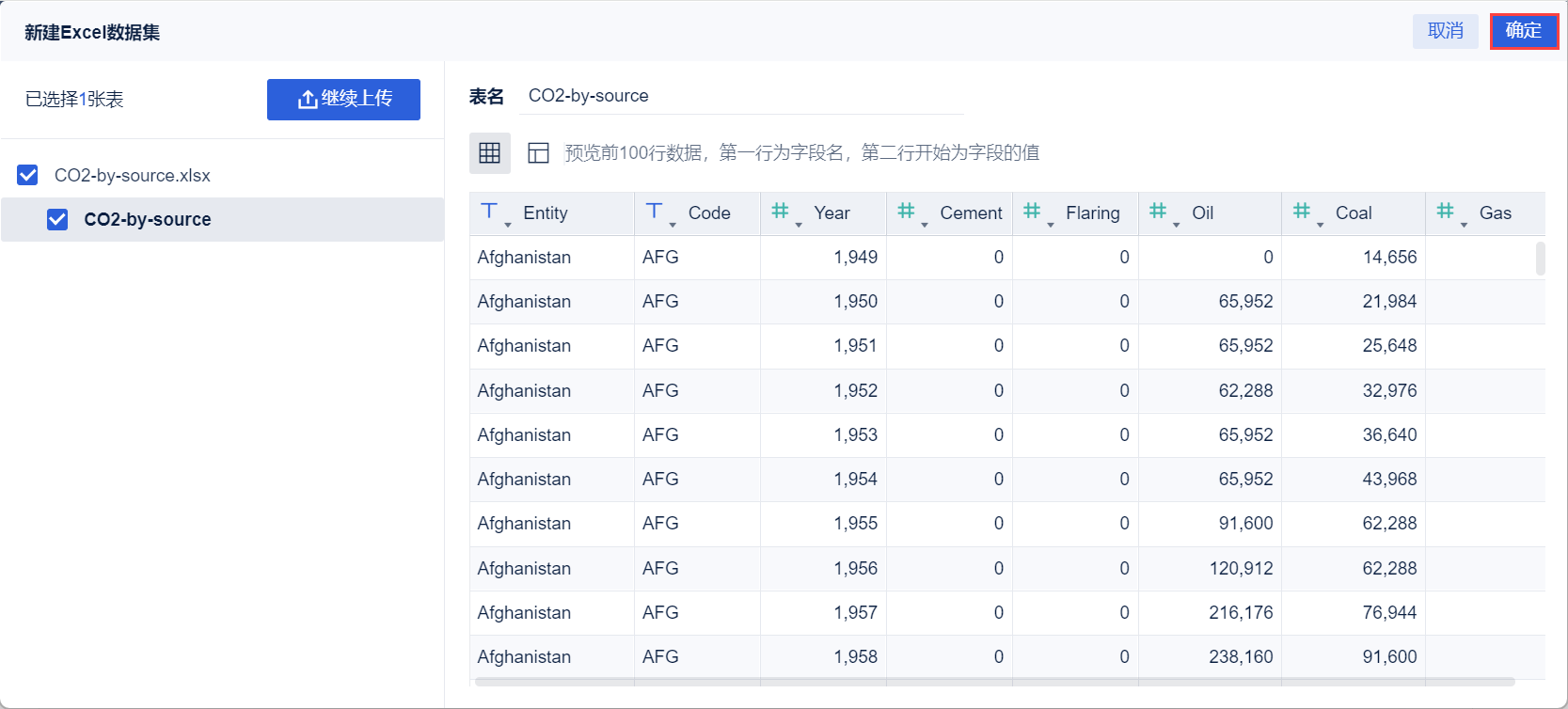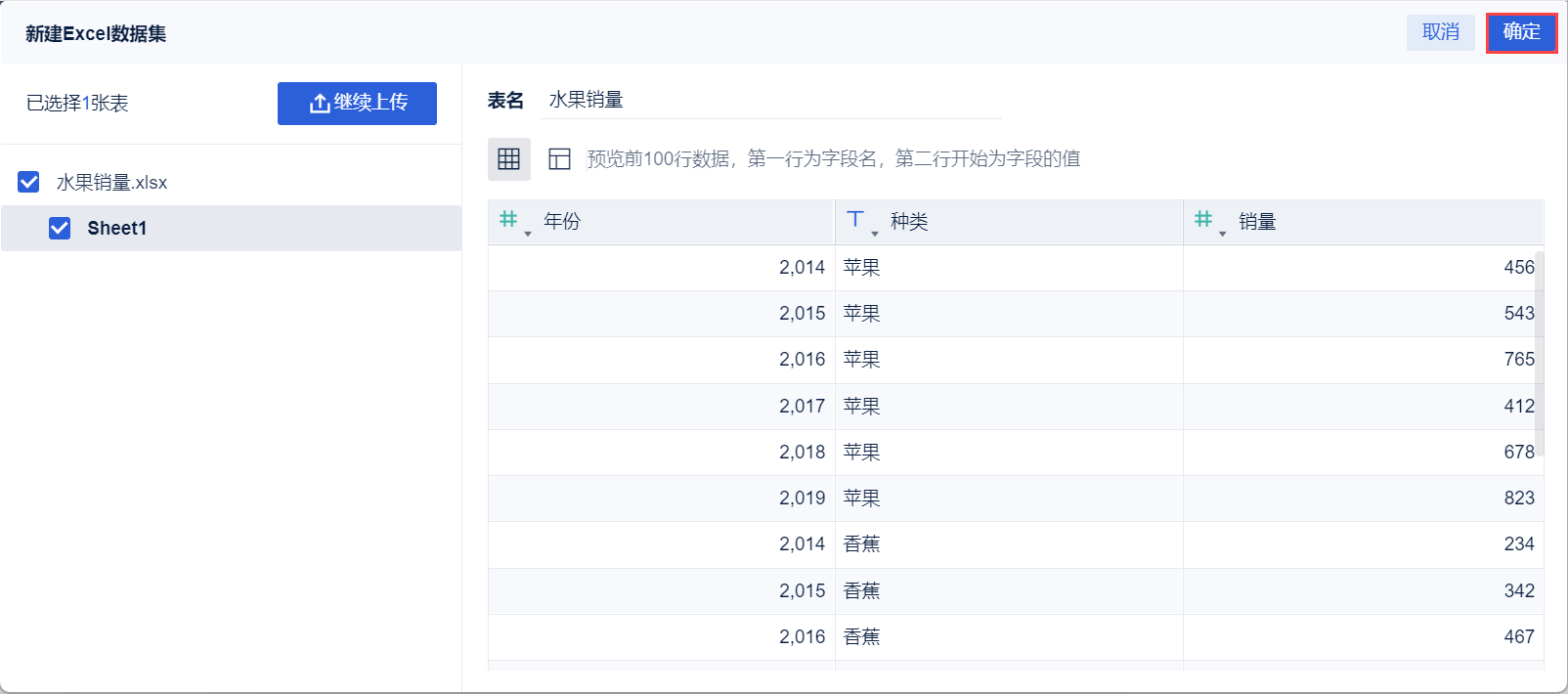 2)点击「本地Excel文件>上传数据」,上传表数据。如下图所示:
