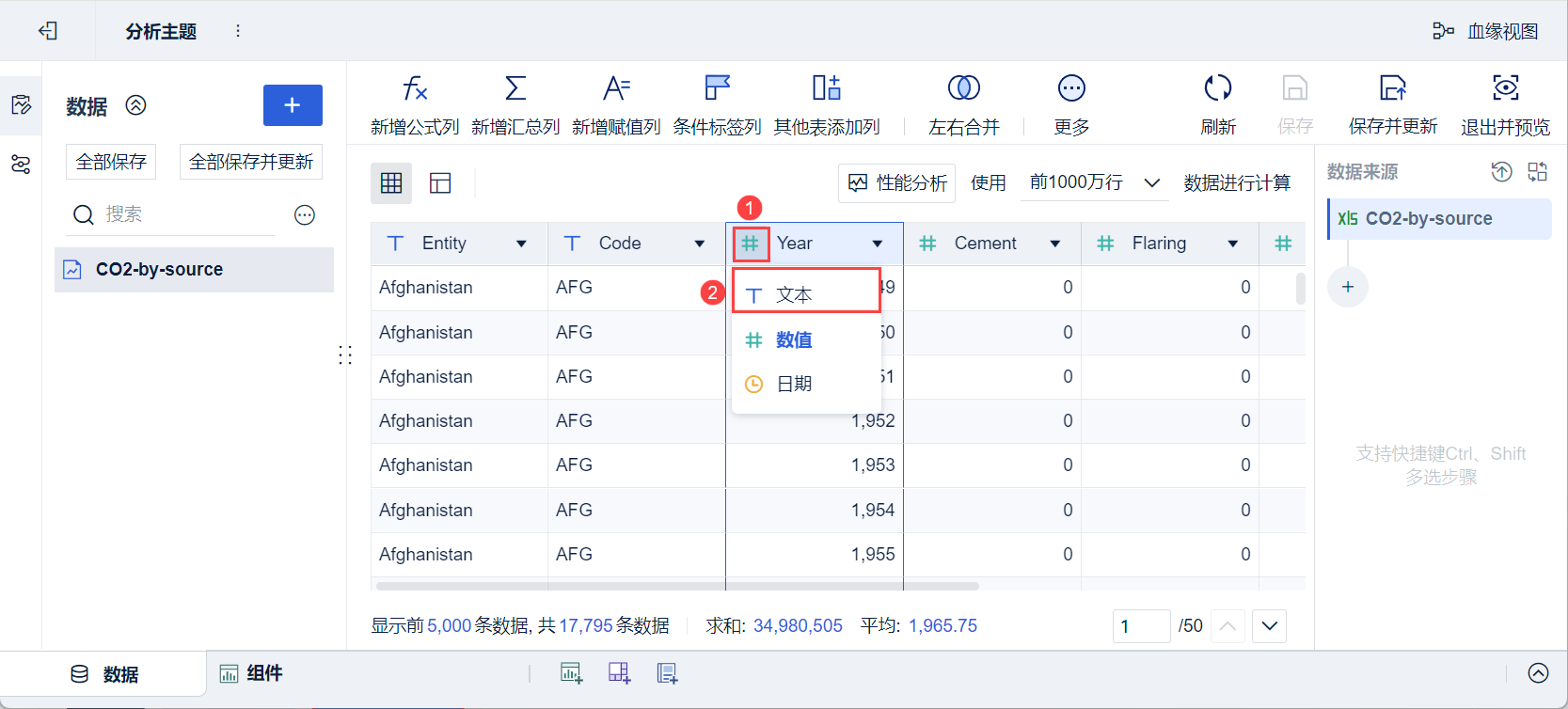 4)点击表头「Year」字段前的「#」按钮,选择「T 文本」,设置其为文本格式,如下图所示: