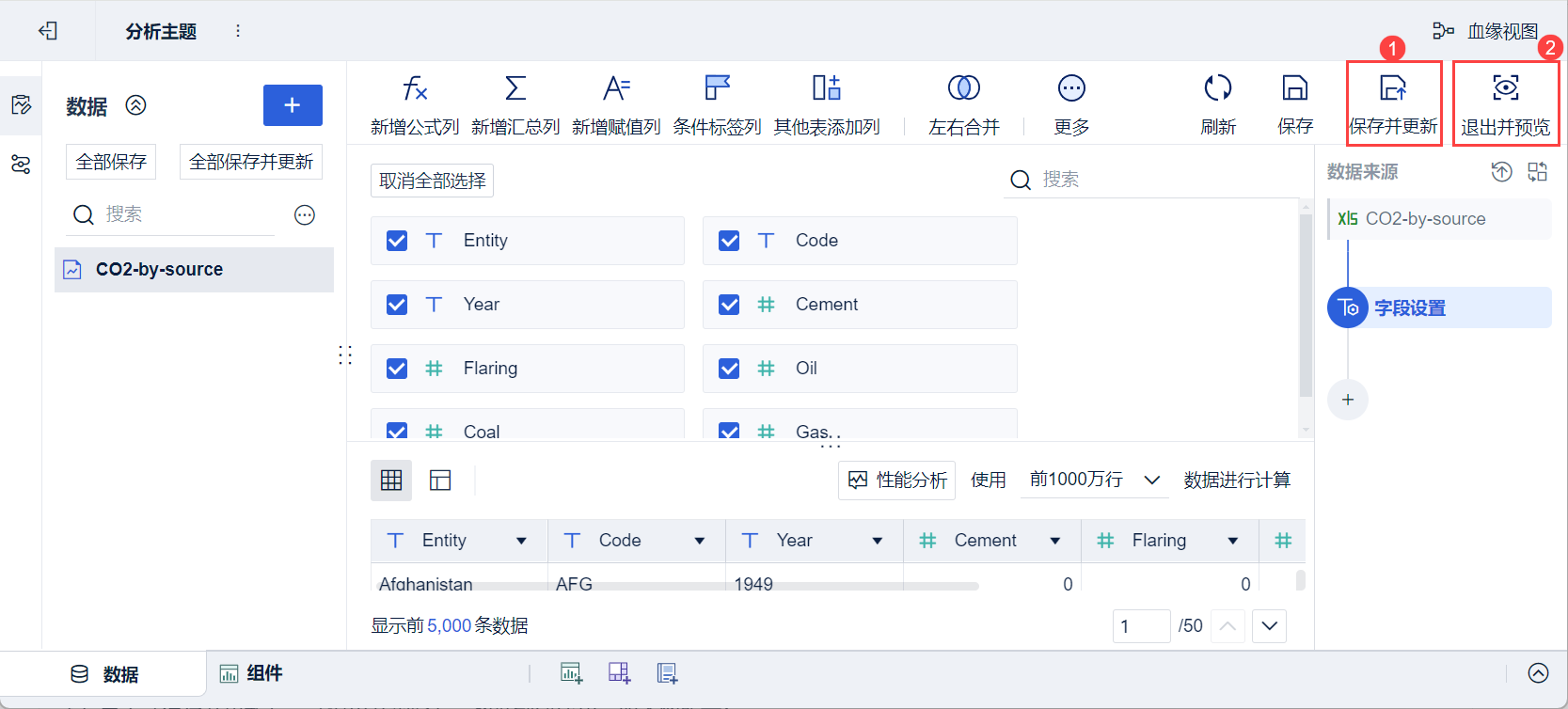 3)将左侧待分析区域的「Year」拖入分析区域的横轴,「Cement」、「Coal」、「Flaring」、「Gas」、「Oil」拖入纵轴,如下图所示: