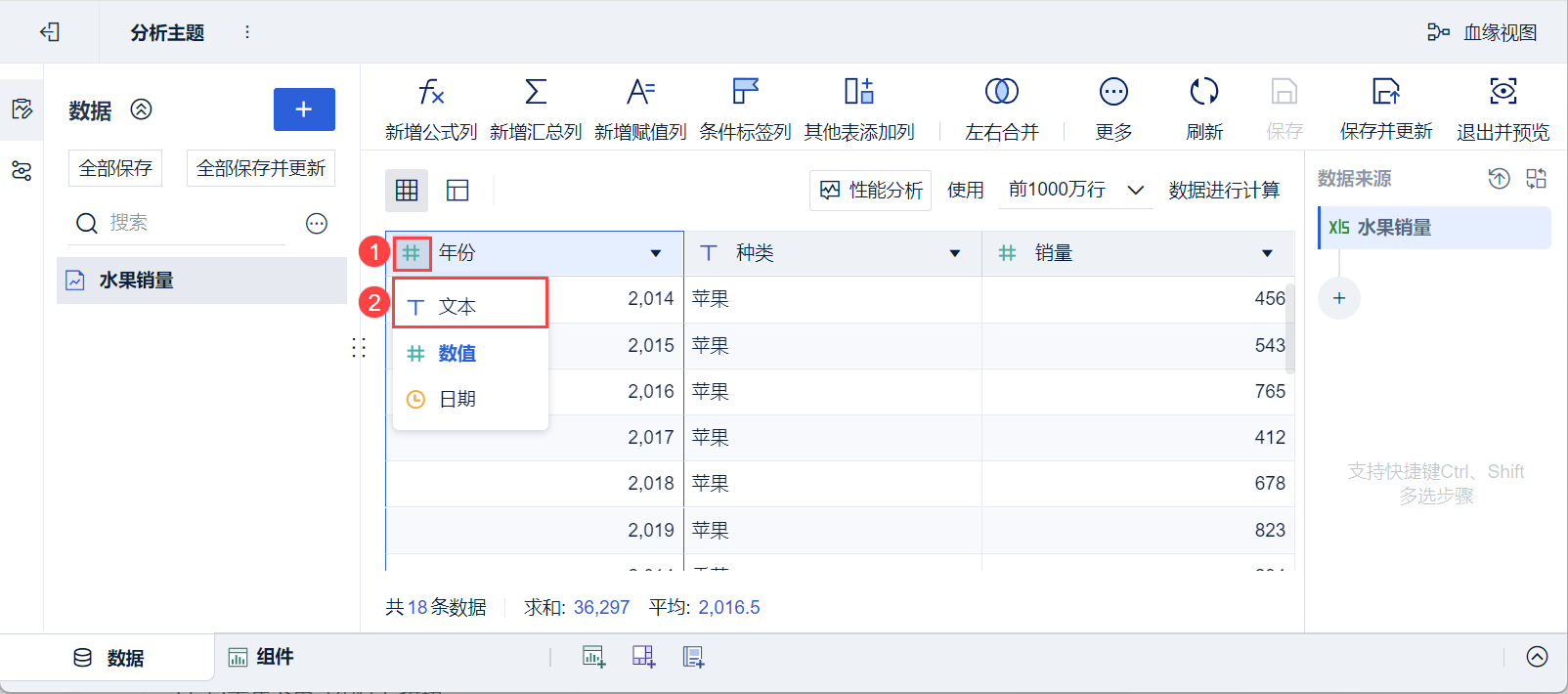 4)点击表头「年份」字段前的「#」按钮,选择「T 文本」,设置其为文本格式,如下图所示: