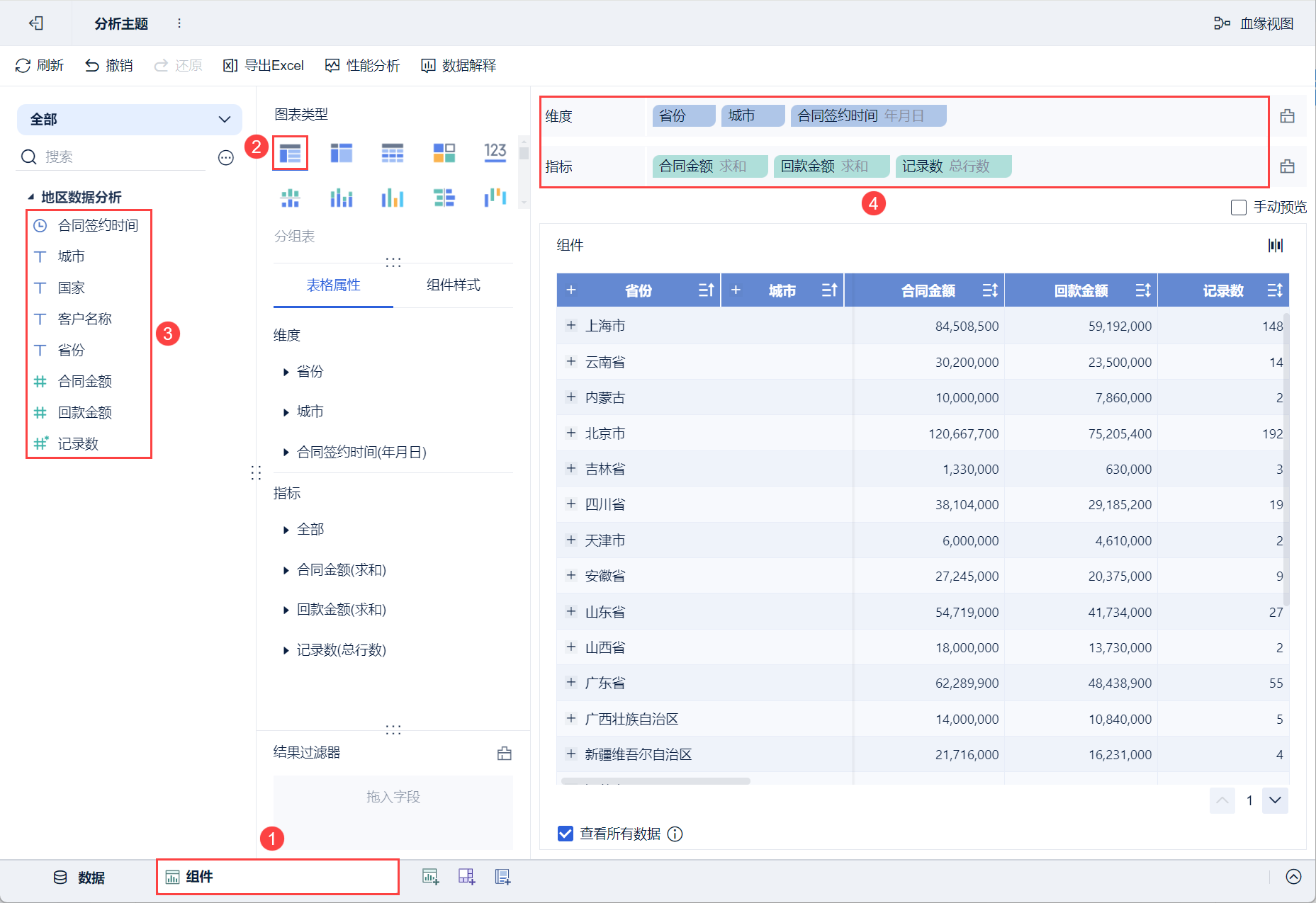 3)将左侧待分析区域的「省份」「城市」「合同签约时间」拖入维度栏,「合同金额」「回款金额」「记录数」拖入指标栏,如下图所示: