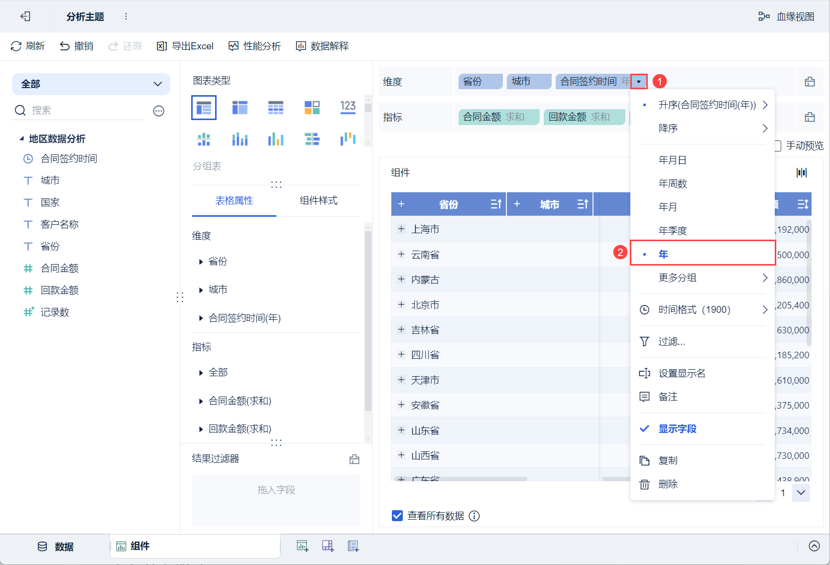 4)点击维度栏的「合同签约时间」的下拉按钮,选择其为「年」分组。