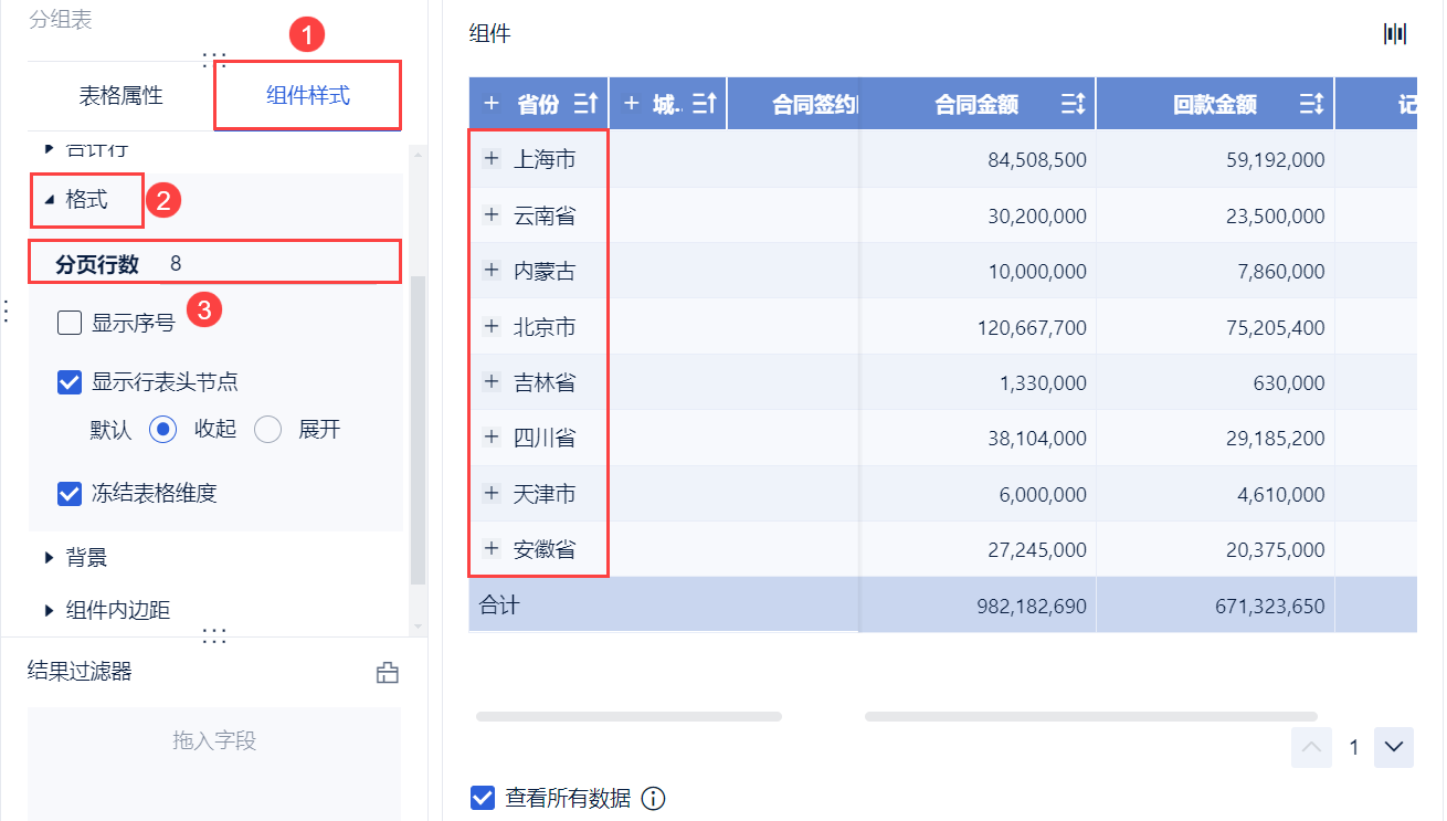以分组表为例,在「组件样式>格式」中,支持设置「分页行数」、「显示序号」、「显示行表头节点」、「冻结表格维度」。如下图所示: