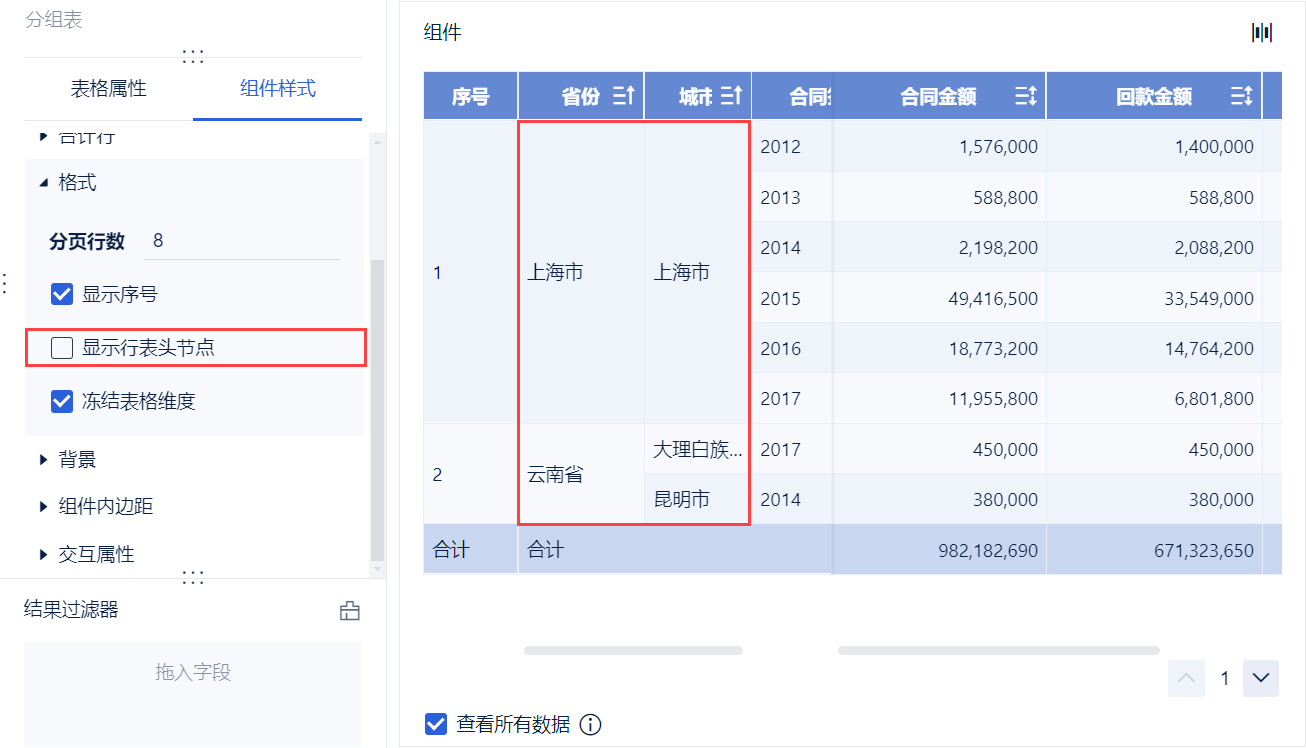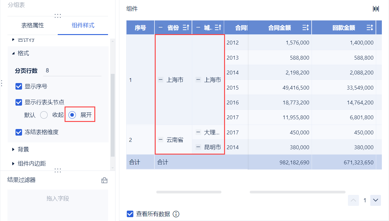 「显示行表头节点」默认为勾选状态,默认选择「收起」,点击「展开」,则展开表格分组的所有行表头节点,如下图所示:
