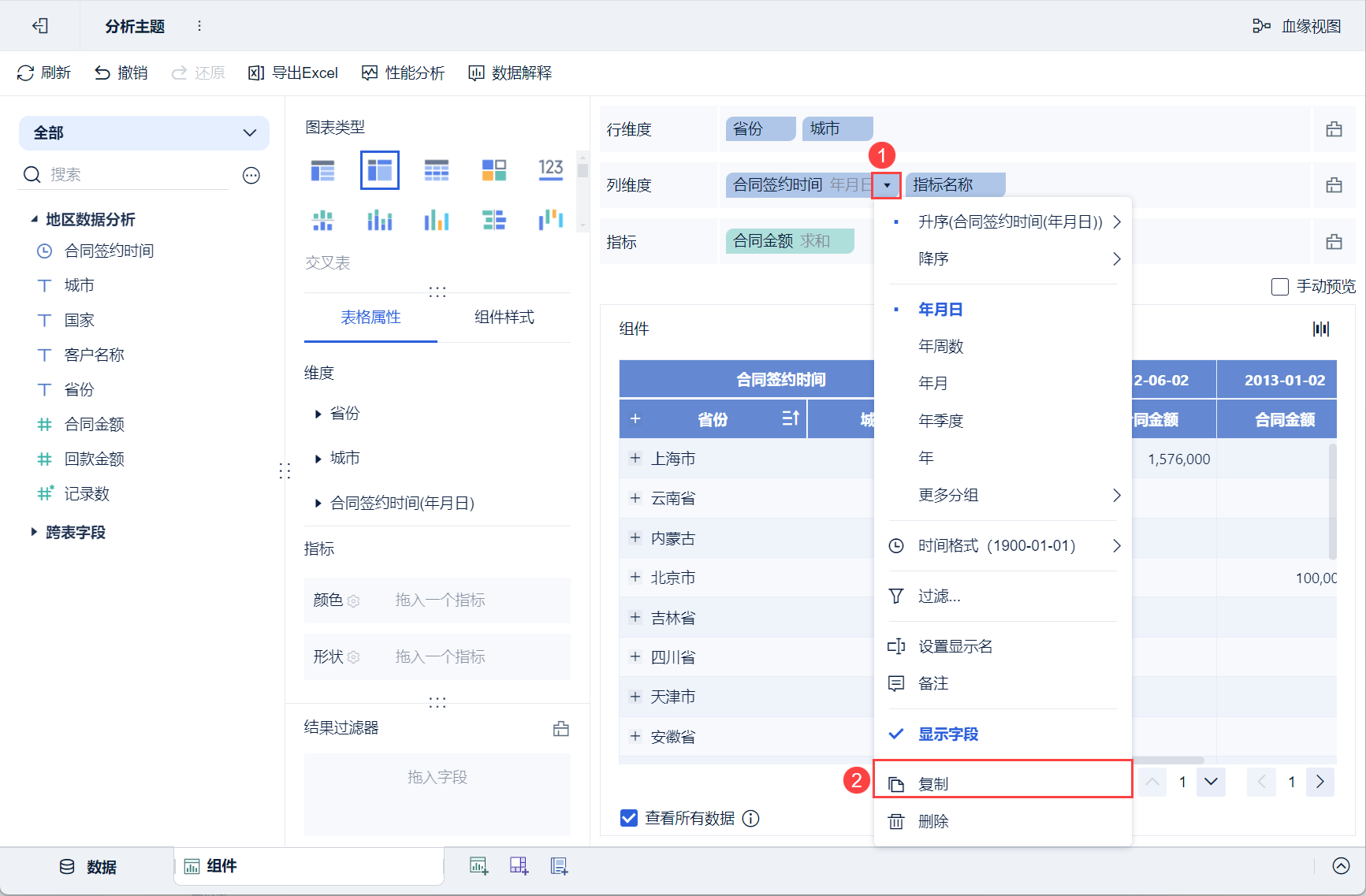 4)点击列维度栏中「合同签约时间」的下拉按钮,选择「复制」,复制一个「合同签约时间」字段