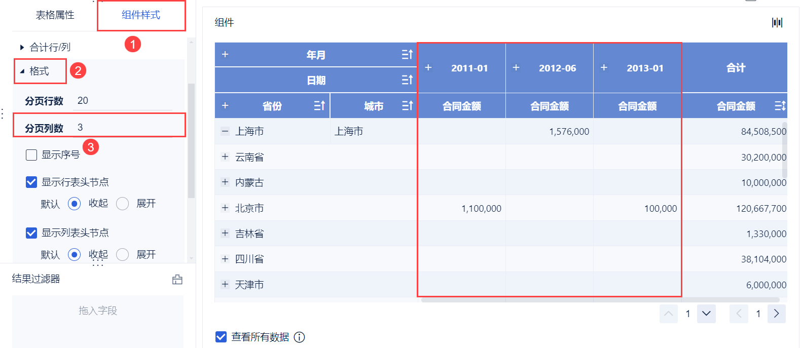 点击「组件样式>格式」,设置分页列数为「3」,则此交叉表除了维度字段和合计列外每页只显示3列,超过3列需要翻页展示,如下图所示: