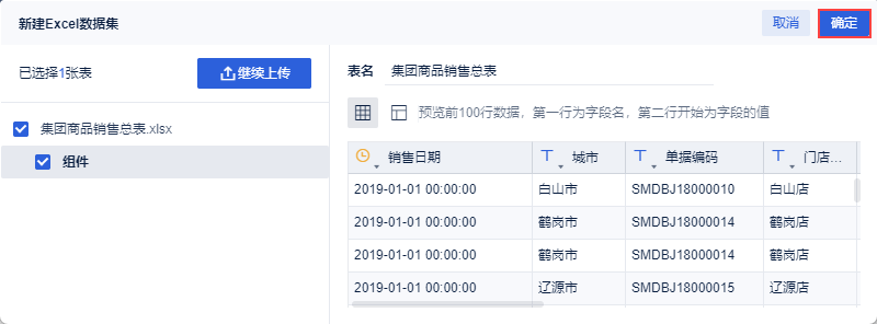 2)点击「本地Excel文件>上传数据」,上传表数据。如下图所示: