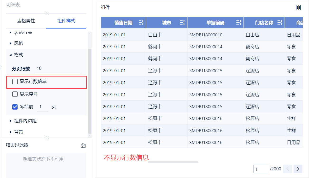 明细表支持设置分页行数、显示行数信息、显示序号、冻结前N列。