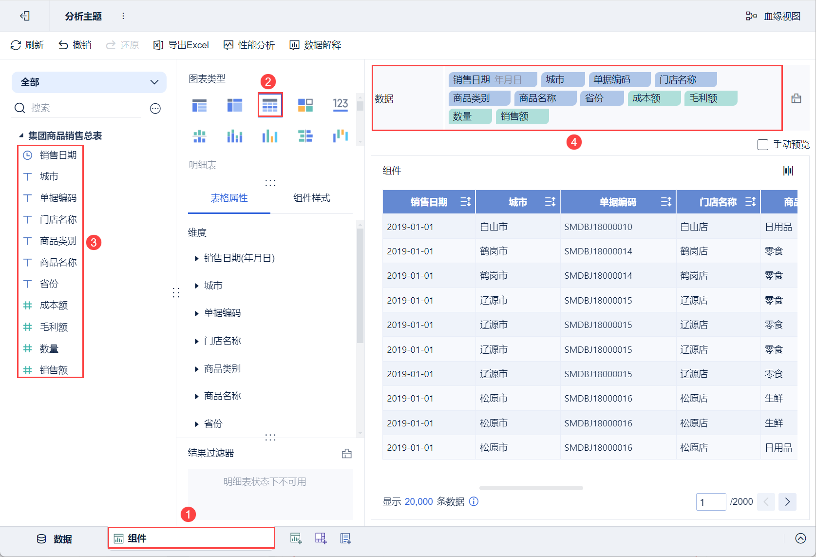 注: FineBI 5.1.14之后的版本明细表支持设置是否显示当前行数和总行数信息,默认明细表取 20000 行数据,不足 20000 行取所有数据,默认显示当前行数和总行数信息,在此之前的版本无论有多少数据,明细表默认只展示 1000 行。